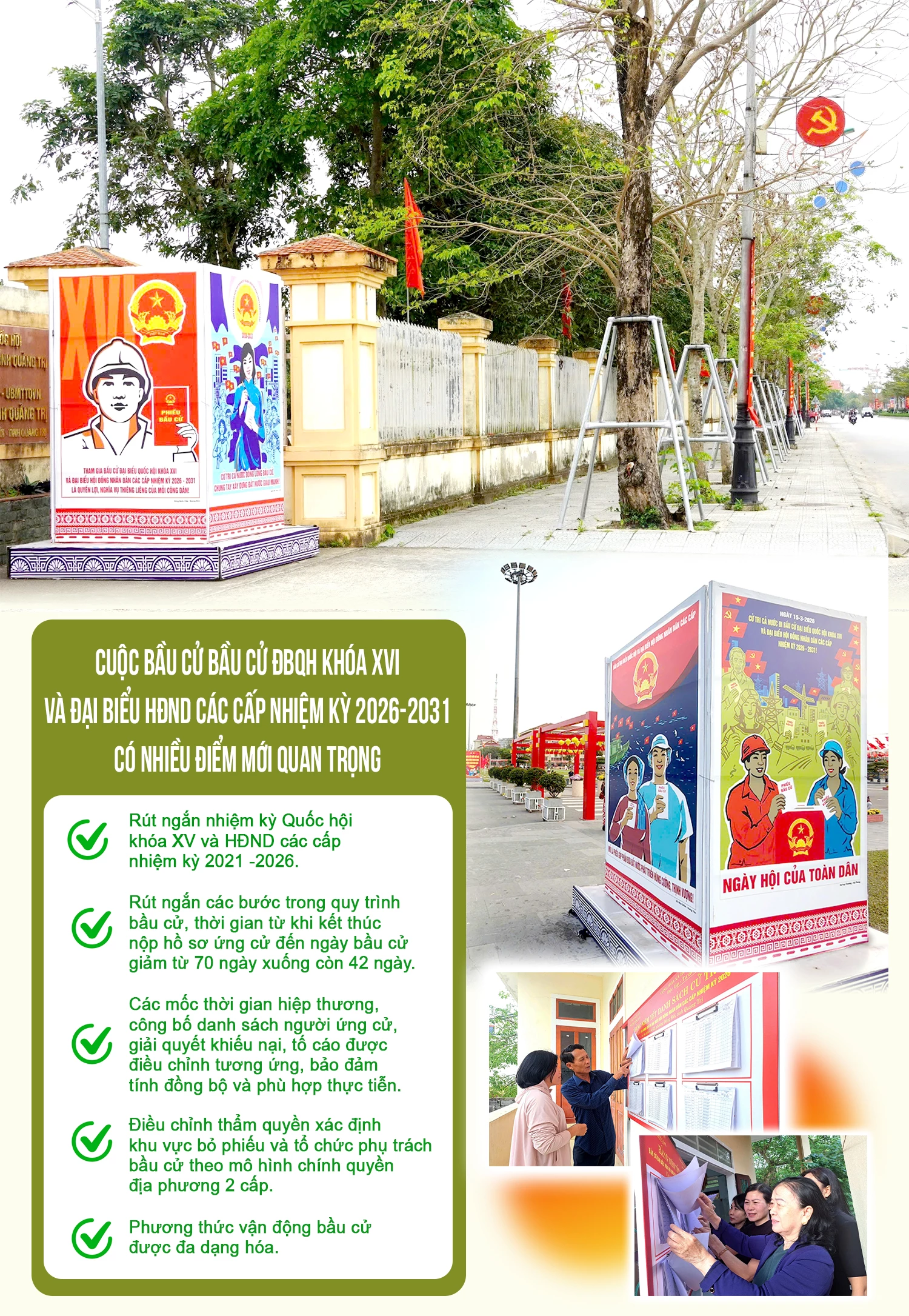 Thời gian từ khi kết thúc nộp hồ sơ ứng cử đến ngày bầu cử giảm từ 70 ngày còn 42 ngày; các mốc thời gian hiệp thương, công bố danh sách người ứng cử, giải quyết khiếu nại, tố cáo cũng được điều chỉnh tương ứng, bảo đảm tính đồng bộ và phù hợp thực tiễn; điều chỉnh thẩm quyền xác định khu vực bỏ phiếu và tổ chức phụ trách bầu cử theo mô hình chính quyền địa phương 2 cấp.