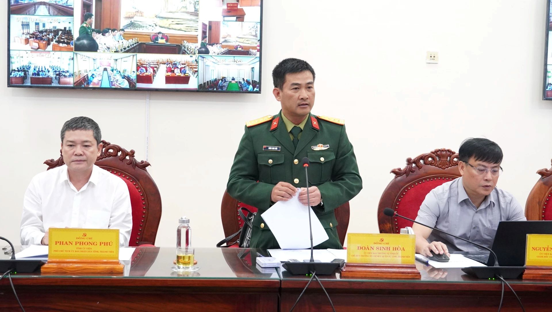 Đồng chí Đại tá Đoàn Sinh Hòa, Chỉ huy trưởng Bộ Chỉ huy Quân sự tỉnh phát biểu tại phiên họp