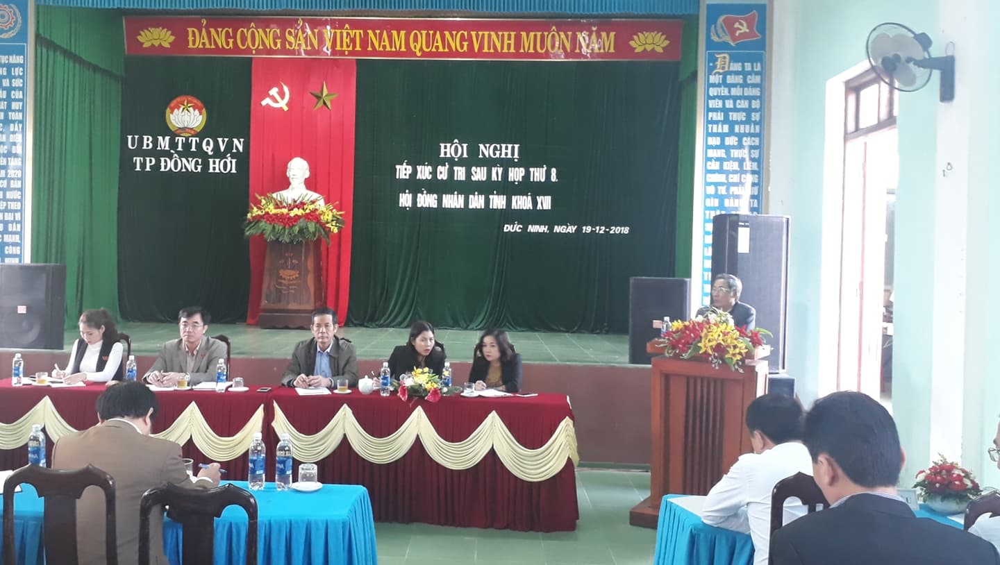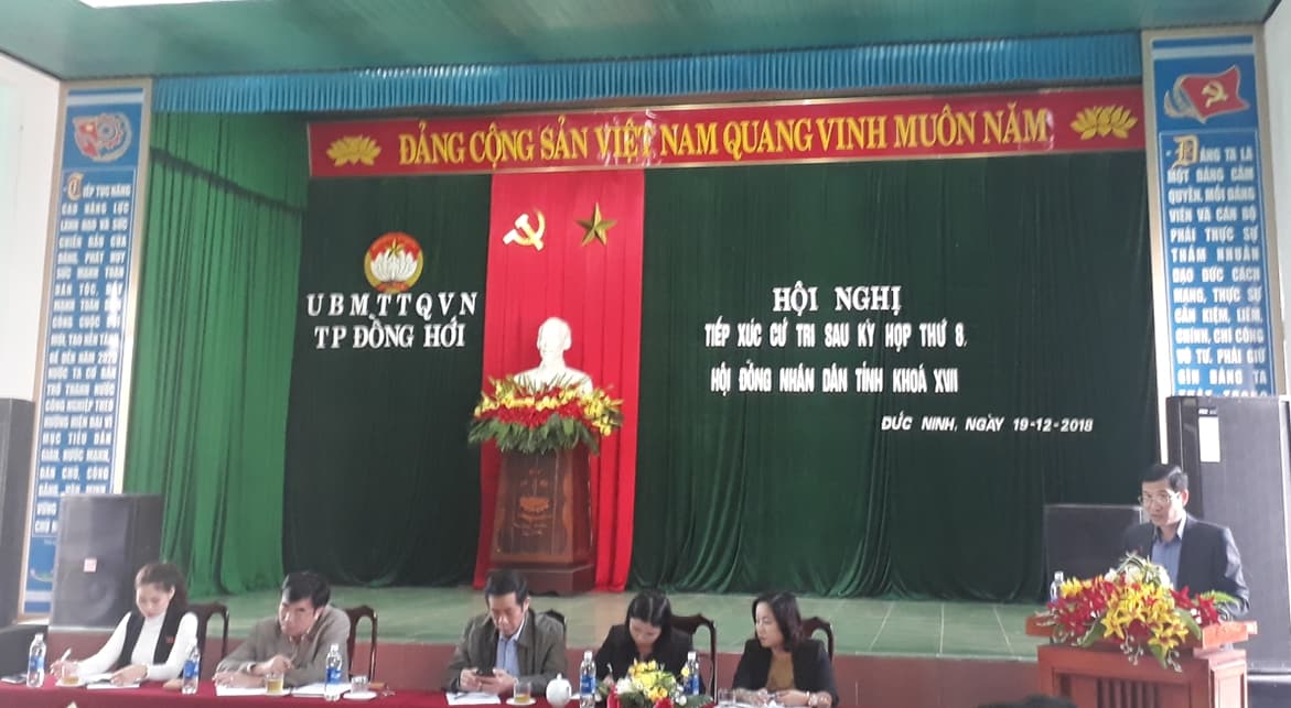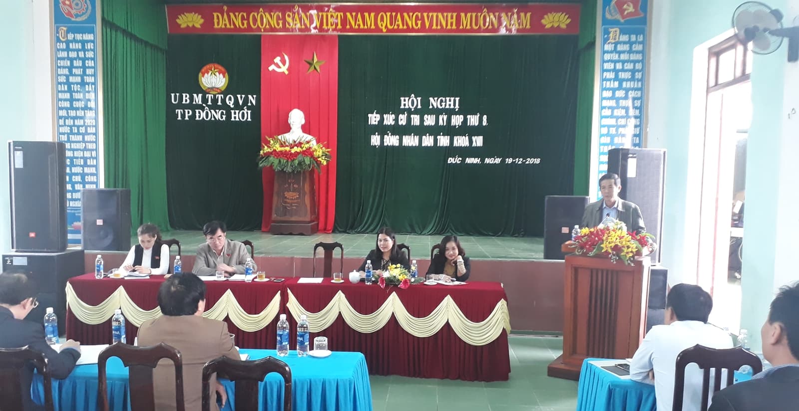 Sáng ngày 19/12/2018, tổ đại biểu HĐND tỉnh gồm các đại biểu: Ông Trần Công Thuật, Phó Bí thư Thường trực Tỉnh ủy, Chủ tịch UBND tỉnh, Phó Trưởng đoàn đại biểu Quốc hội tỉnh; ông Nguyễn Lương Bình, Tỉnh ủy viên, Chủ tịch Liên đoàn Lao động tỉnh; bà Nguyễn Thị Chung, Tiểu thương chợ Đồng Hới đã có buổi tiếp xúc cử tri tại xã Đức Ninh, thành phố Đồng Hới.