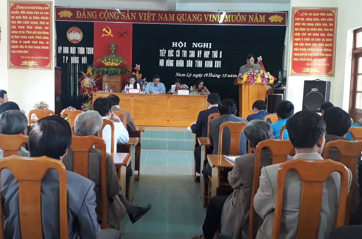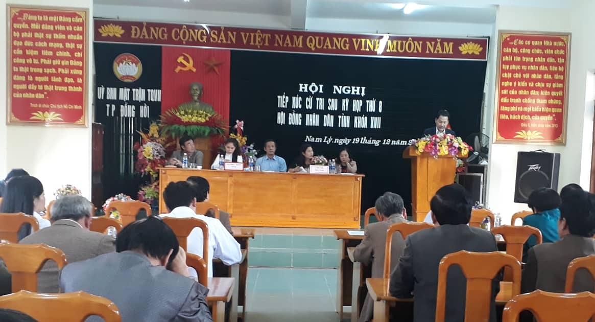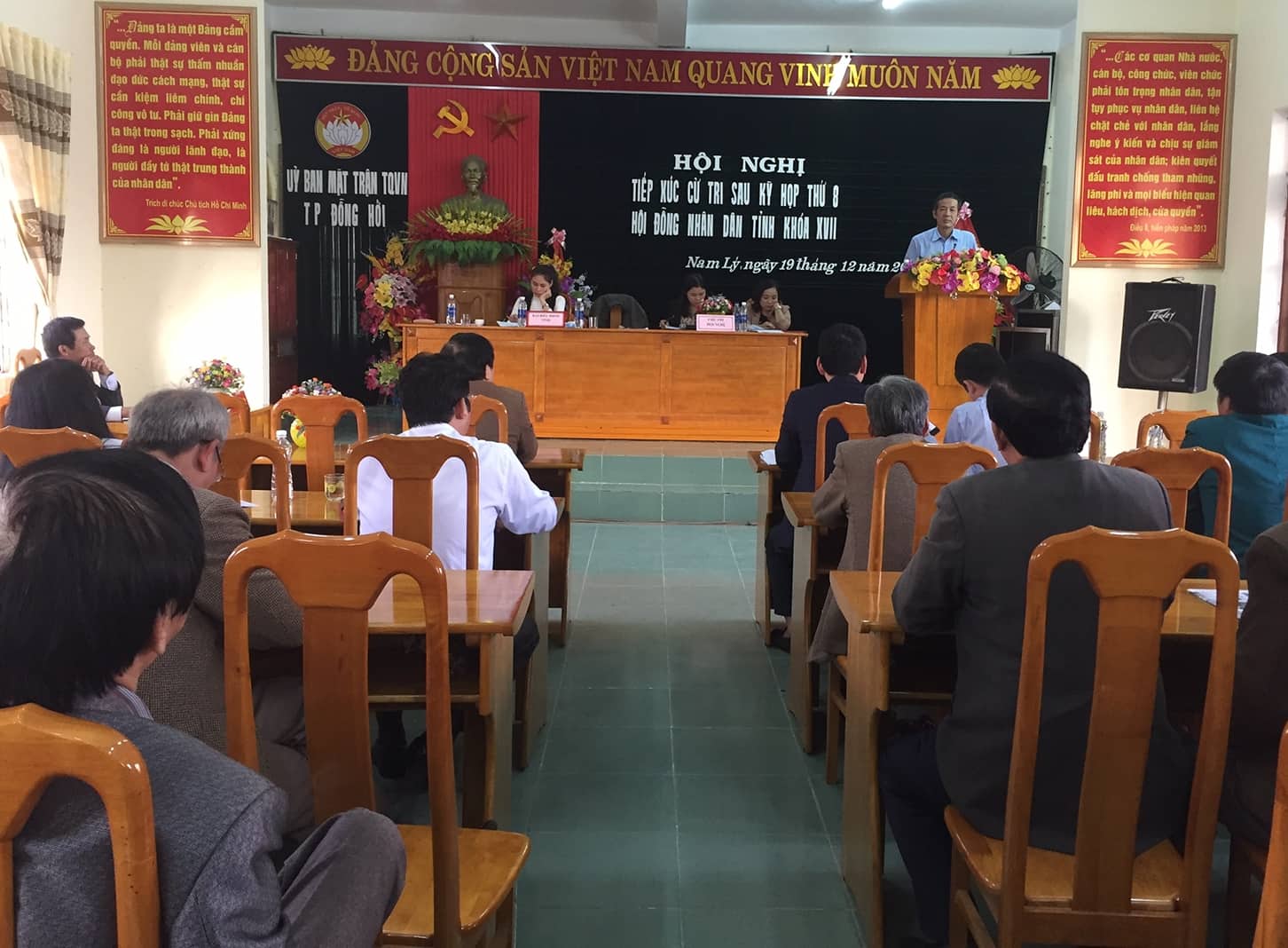 Chiều ngày 19/12/2018, tại Hội trường UBND phường Nam Lý, tổ đại biểu HĐND tỉnh gồm các đại biểu: Ông Trần Công Thuật, Phó Bí thư Thường trực Tỉnh ủy, Chủ tịch UBND tỉnh, Phó Trưởng đoàn đại biểu Quốc hội tỉnh; ông Nguyễn Lương Bình, Tỉnh ủy viên, Chủ tịch Liên đoàn Lao động tỉnh; bà Nguyễn Thị Chung, Tiểu thương chợ Đồng Hới tiến hành tiếp xúc cử tri sau kỳ họp thứ 8. Cùng dự có đại diện lãnh đạo sở Kế hoạch - Đầu tư, đại diện Thường trực HĐND, UBND, UBMTTQ thành phố, Thường trực HĐND, UBND, UBMTTQ, các ban, ngành đoàn thể và các bậc cử tri trên địa bàn phường Nam Lý.
