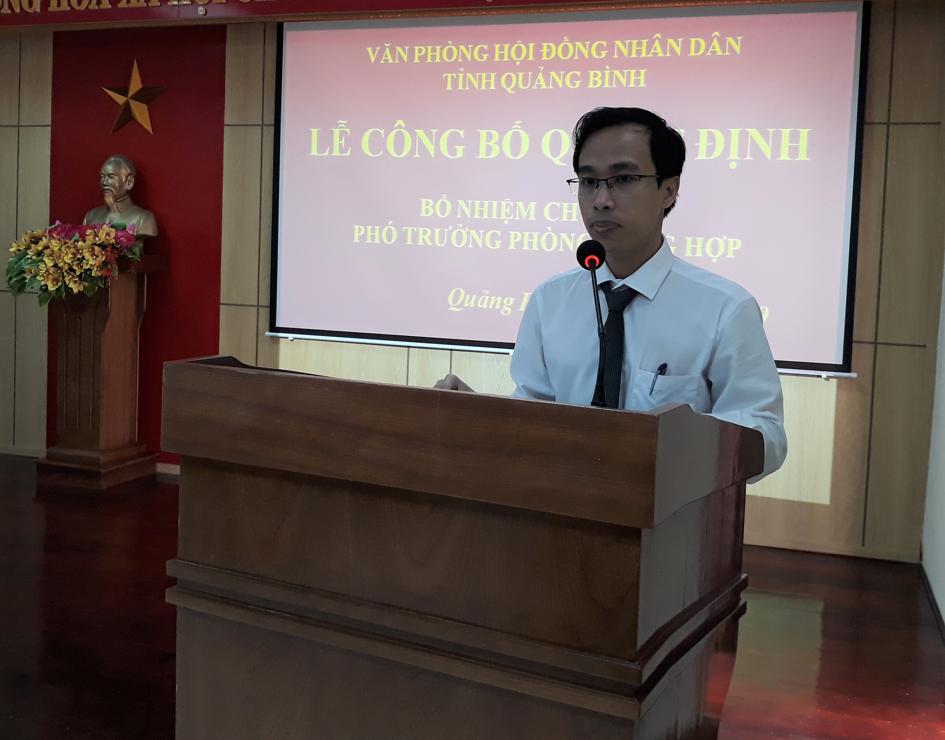 Đồng chí Hoàng Tự Quốc Hùng - Phó Trưởng phòng Tổng hợp, phụ trách phòng thay mặt cho các cán bộ được bổ nhiệm cảm ơn sự tin tưởng, tín nhiệm của Thường trực HĐND, các Ban của HĐND, lãnh đạo Văn phòng HĐND tỉnh cùng toàn thể cán bộ, công chức Văn phòng HĐND tỉnh; và hứa sẽ đoàn kết, phát huy hơn nữa năng lực của bản thân, không ngừng học hỏi để nâng cao năng lực quản lý, năng động, sáng tạo, quyết tâm hoàn thành tốt nhiệm vụ được giao, duy trì khối đoàn kết thống nhất trong Phòng Tổng hợp, đáp ứng yêu cầu tham mưu cho HĐND tỉnh.