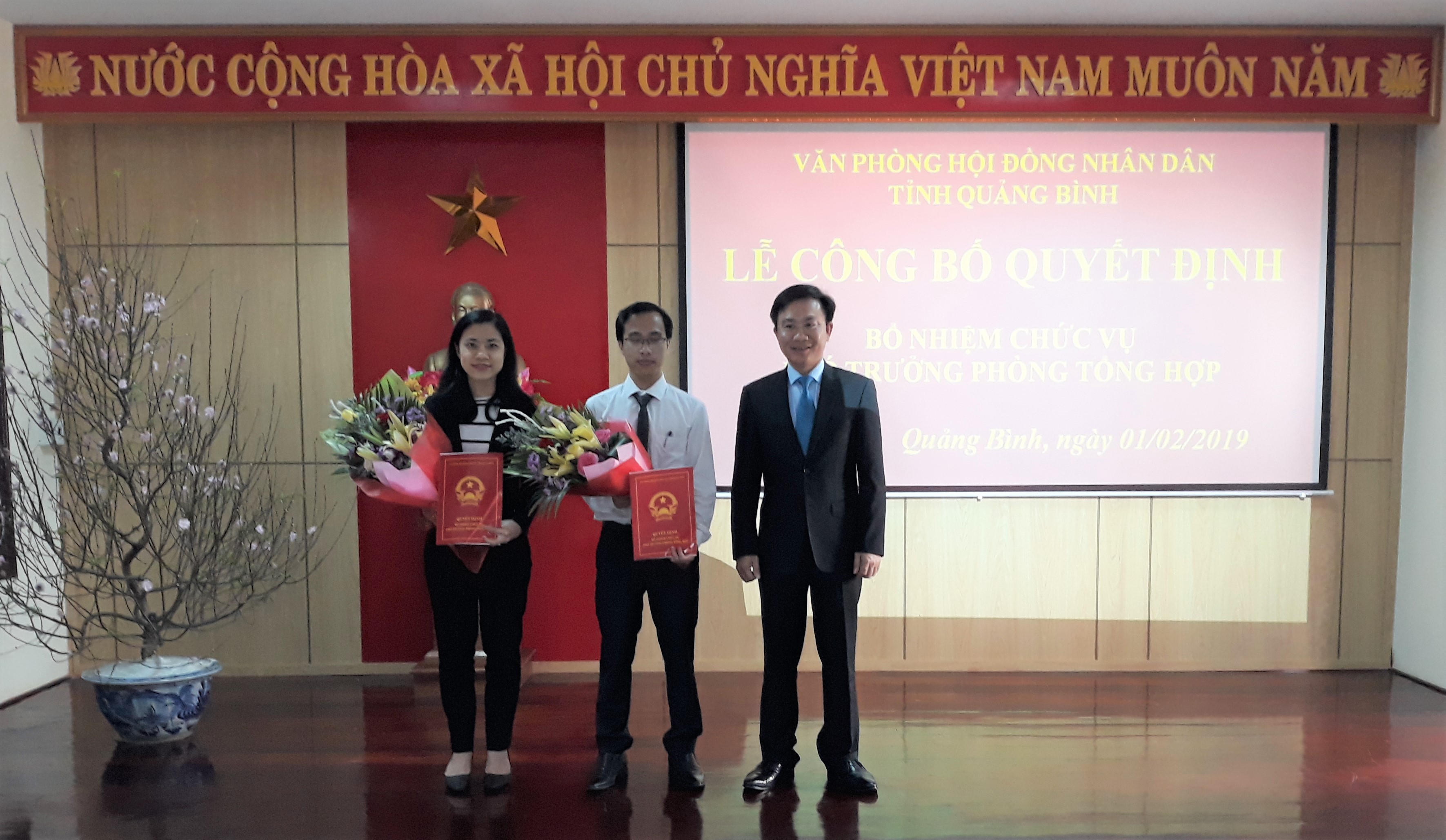 Chiều ngày 01/02/2019, Văn phòng HĐND tỉnh đã tổ chức Lễ công bố và trao quyết định bổ nhiệm chức vụ Phó Trưởng Phòng Tổng hợp cho 02 đồng chí: Hoàng Tự Quốc Hùng và Hoàng Thị Phương Hảo.