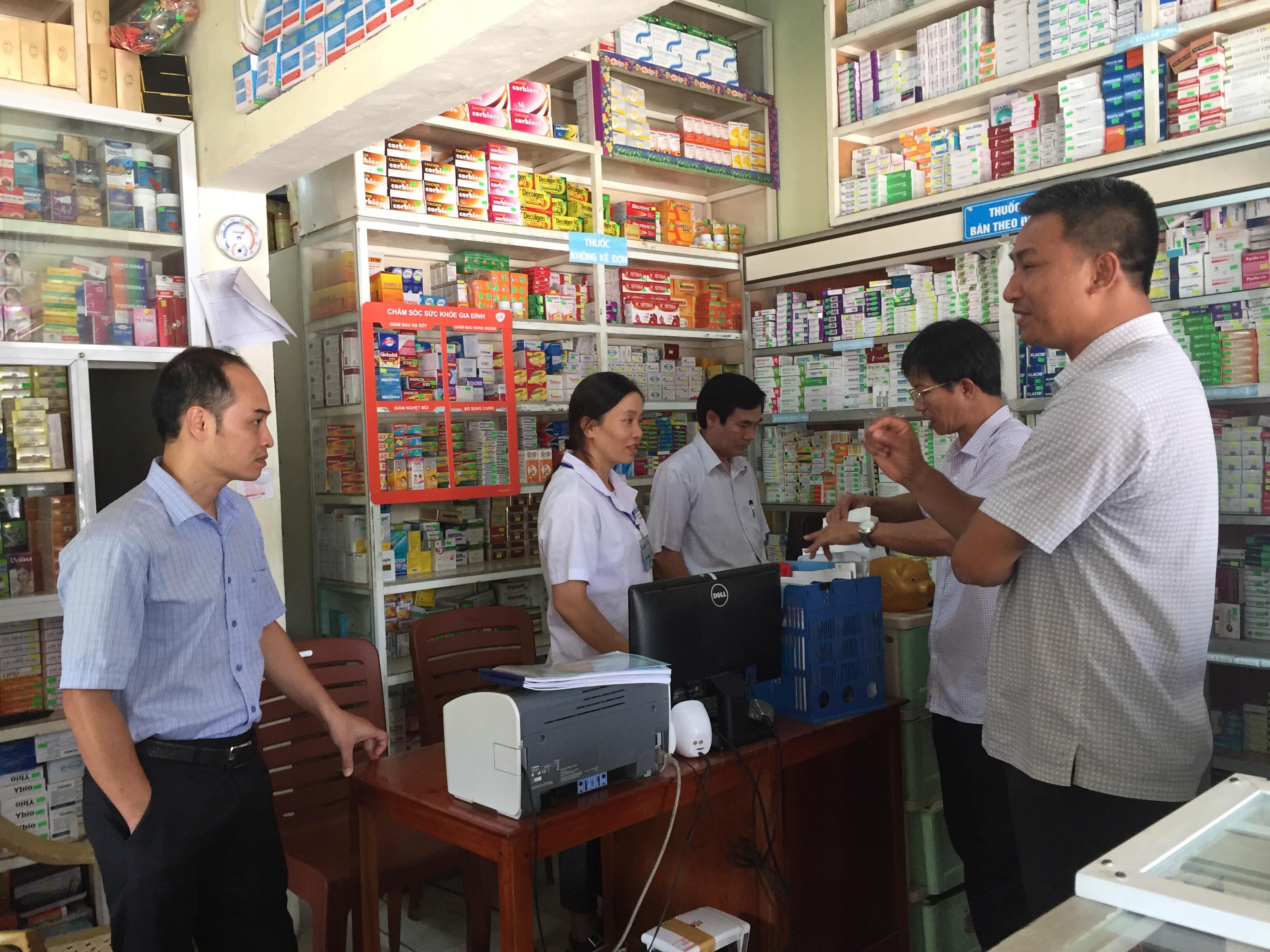 Ảnh: Đoàn kiểm tra hồ sơ có liên quan và nghe báo cáo tình hình chấp hành pháp luật vê hành dược tư nhân tại Nhà thuốc Nga Sơn