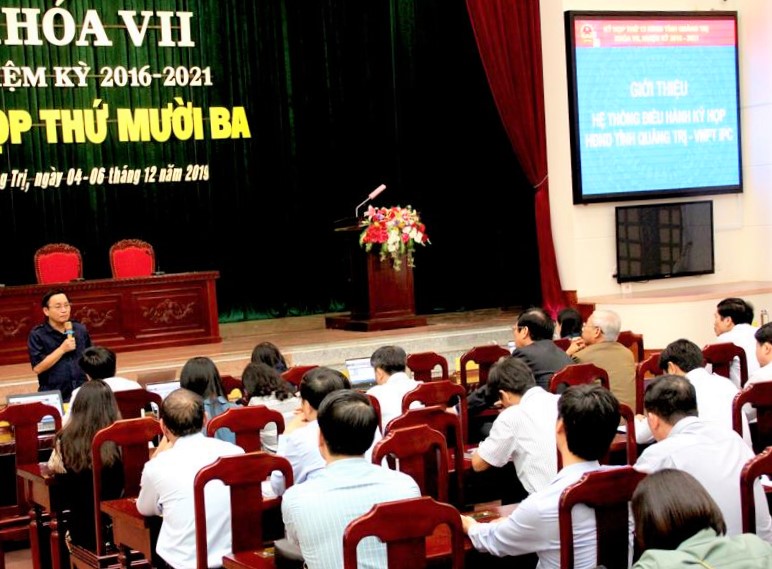 Ảnh: Thường trực HĐND tỉnh Quảng Trị giới thiệu mô hình kỳ họp không giấy