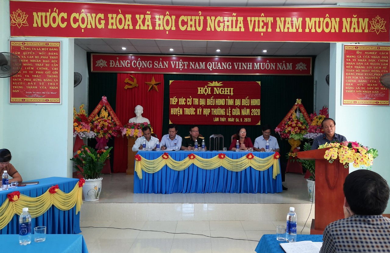 Chiều ngày 04/6/2020, Tổ đại biểu HĐND tỉnh gồm các đại biểu: Trần Văn Tuân, nguyên Ủy viên Ban Thường vụ Tỉnh ủy, nguyên Chủ tịch Ủy ban MTTQVN tỉnh; Trương Thị Phương Lan, Phó Trưởng Ban Pháp chế HĐND tỉnh đã có buổi tiếp xúc với cử tri huyện Lệ Thủy trước kỳ họp thường lệ giữa năm 2020, HĐND tỉnh khóa XVII tại xã Lâm Thủy. Cùng dự có đại diện lãnh đạo các sở, ngành, UBND huyện Lệ Thủy và các xã tại đơn vị bầu cử.