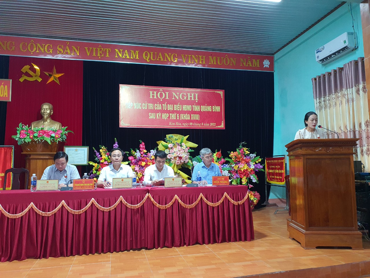 Sau khi nghe báo cáo, cử tri kiến nghị một số nội dung sau: Cần giải quyết dứt điểm vấn đề ranh giới và đất sản xuất giữa hai xã Kim Hóa và Lê Hóa; quan tâm kinh phí hoạt động, chế độ chính sách đối với Hội nạn nhân chất độc da cam, Hội truyền thống Trường Sơn, gia đình chính sách, người có công với cách mạng; một số vấn đề liên quan đến chế độ bảo trợ xã hội đối với người khuyết tật, việc giám định đối với người khuyết tật để bảo đảm công bằng trong việc thực hiện các chế độ chính sách; quan tâm duy tu, bảo dưỡng cầu treo thôn Kim Tiến, xã Kim Hóa, hoặc nghiên cứu đầu tư cầu tràn, phù hợp với yêu cầu sử dụng; vấn đề cấp đất rừng sản xuất và trả lời các nội dung kiến nghị của cử tri tại xã Phong Hóa về nội dung này; cần quản lý hiệu quả việc khai thác cát để bảo đảm vấn đề môi trường, đời sống nhân dân và giữ gìn nguồn tài nguyên; các vấn đề về đền bù, giải phóng mặt bằng trên tuyến đường 12A; quy trình giải quyết các nội dung kiến nghị của cử tri; quan tâm chăm lo hơn nữa việc nâng cao đời sống người dân, nhất là người nghèo…