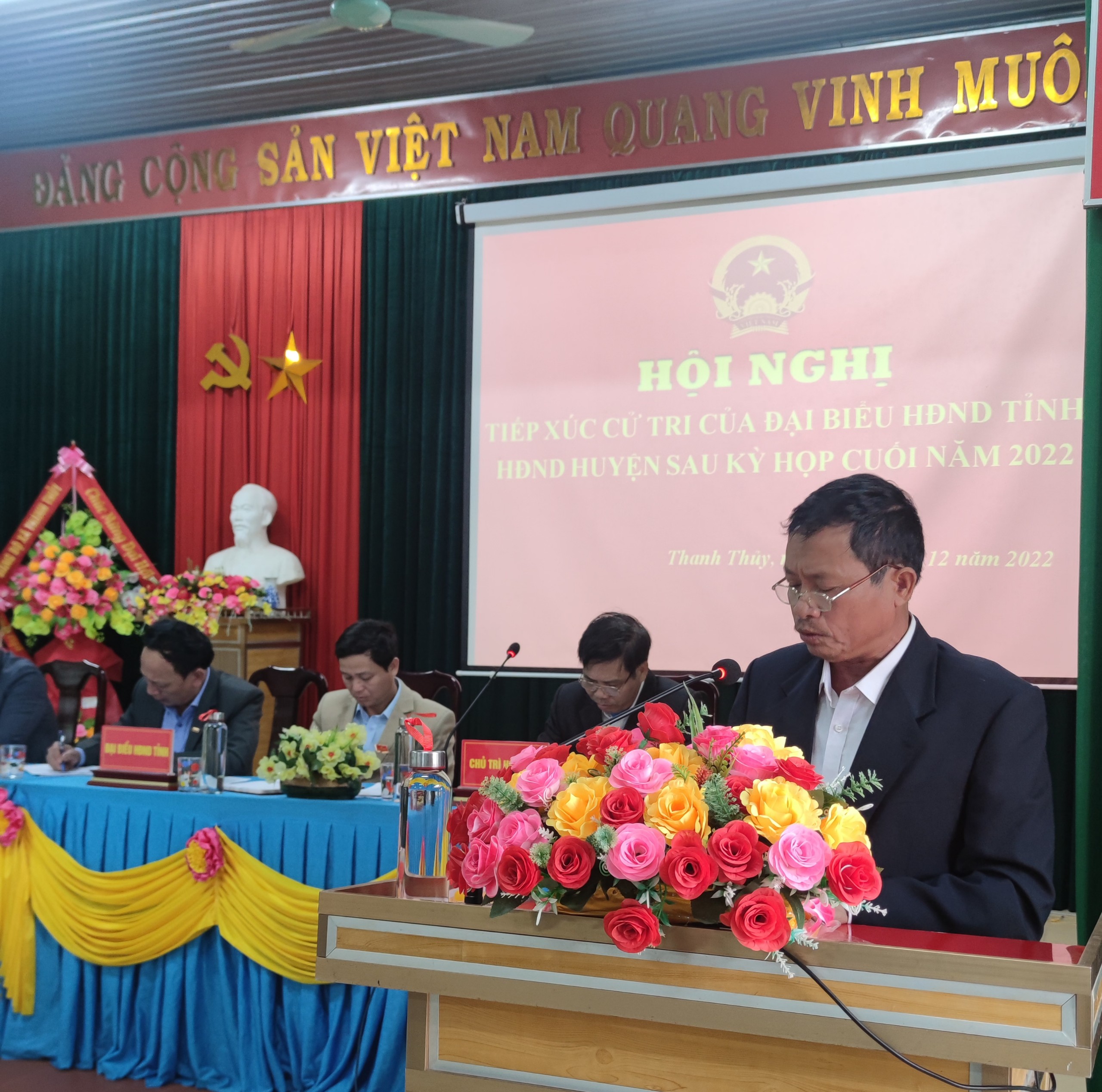 Thực hiện chương trình tiếp xúc cử tri sau kỳ họp thứ 8, HĐND tỉnh khóa XVIII, nhiệm kỳ 2021-2026, sáng ngày 27-12/2022, Tổ đại biểu HĐND tỉnh gồm có: Ông Trần Hải Châu, Phó Bí thư Thường trực Tỉnh ủy, Chủ tịch HĐND tỉnh; ông Võ Xuân Bảy, Chủ tịch Hội Nông dân xã Dương Thủy tổ chức tiếp xúc với cử tri xã Thanh Thủy, huyện Lệ Thủy sau kỳ họp thứ 8. Tham dự buổi tiếp xúc cử tri có các đồng chí đại diện lãnh đạo Sở Nông nghiệp và Pháp triển nông thôn, Văn phòng Đoàn ĐBQH và HĐND tỉnh, lãnh đạo Huyện ủy, UBND huyện, Ủy ban MTTQVN huyện và các đồng chí lãnh đạo các phòng, ban thuộc UBND huyện Lệ Thủy.