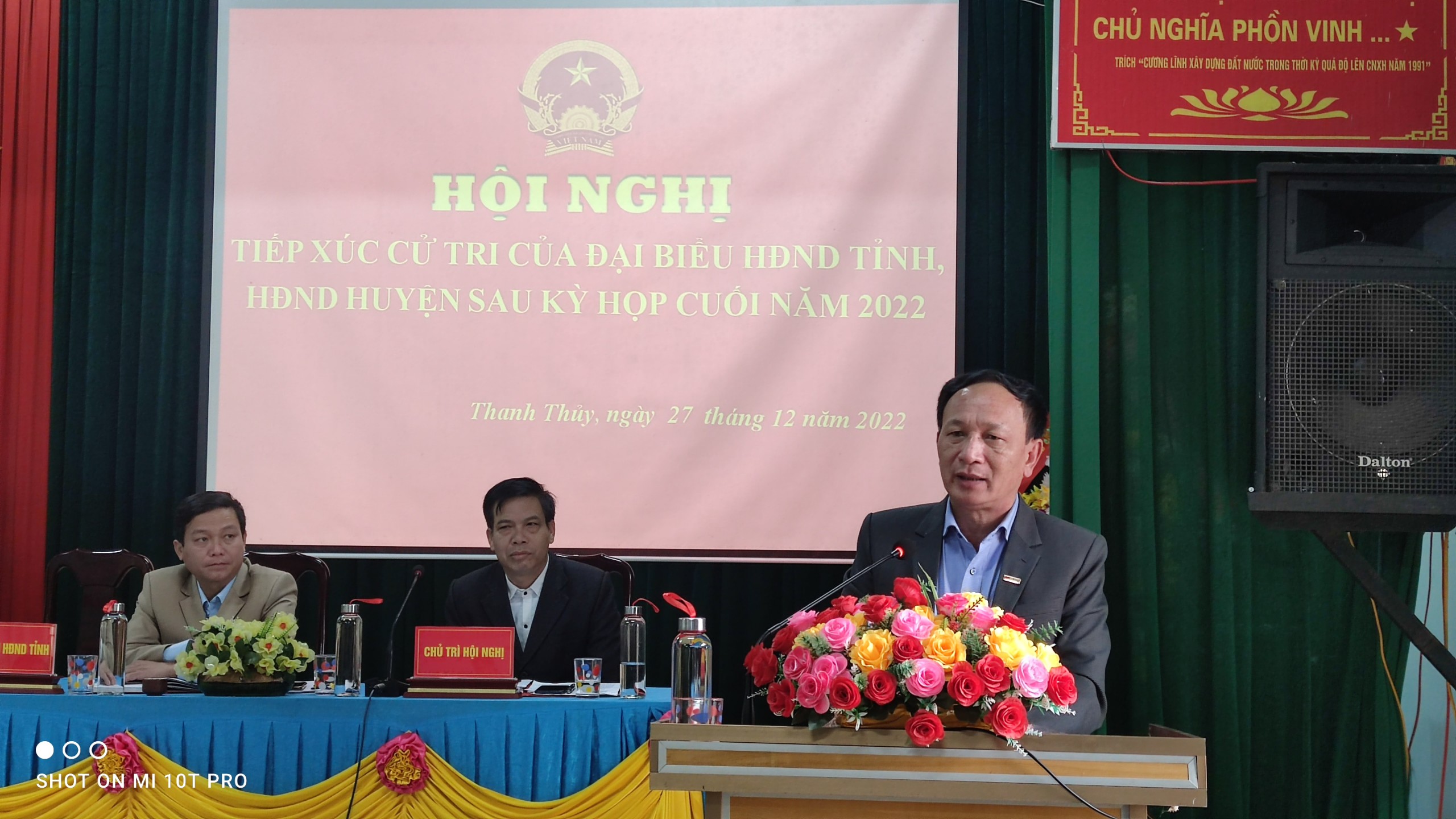 Đồng chí Trần Hải Châu, Phó Bí thư Thường trực Tỉnh ủy, Chủ tịch HĐND tỉnh, phát biểu tại Hội nghị tiếp xúc với cử tri xã Thanh Thủy