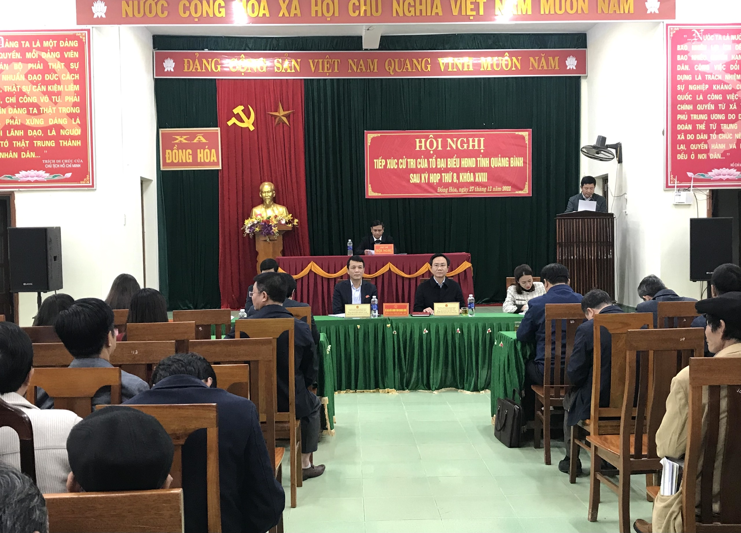 Chiều 27/12/2022, tại UBND xã Đồng Hóa, Tổ đại biểu HĐND tỉnh khóa XVIII tại huyện Tuyên Hóa gồm: Ông Hoàng Xuân Tân, Tỉnh ủy viên, Phó Chủ tịch HĐND tỉnh; ông Lê Công Hữu, Tỉnh ủy viên, Chánh Thanh tra tỉnh; ông Nguyễn Hoài Nam, Tỉnh ủy viên, Bí thư Huyện ủy huyện Tuyên Hóa; bà Đặng Thị Kim Huệ, Bí thư Đoàn TNCS Hồ Chi Minh xã Châu Hóa đã có buổi tiếp xúc cử tri trên địa bàn huyện Tuyên Hóa. Dự buổi tiếp xúc cử tri có đại diện lãnh đạo một số sở, ngành và đại diện lãnh đạo huyện Tuyên Hóa.