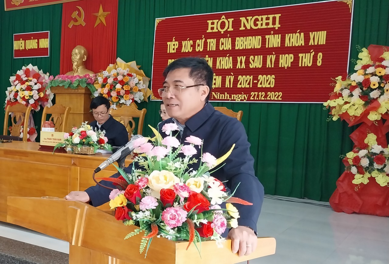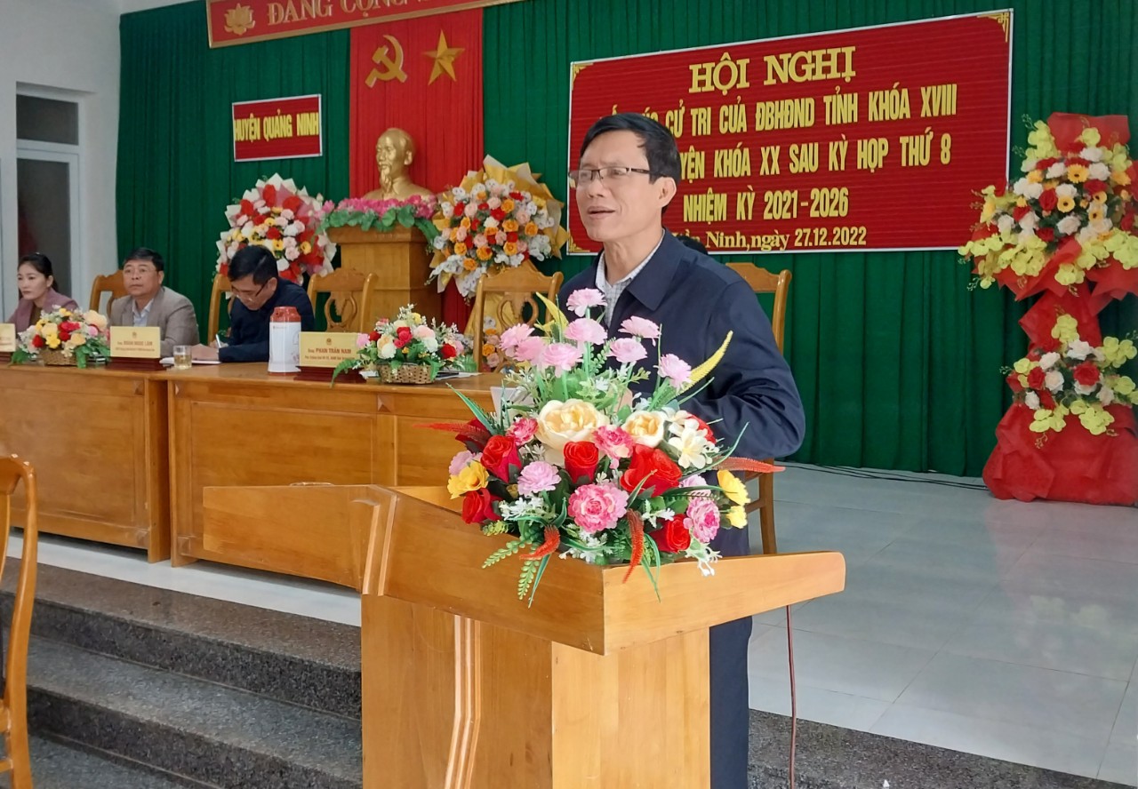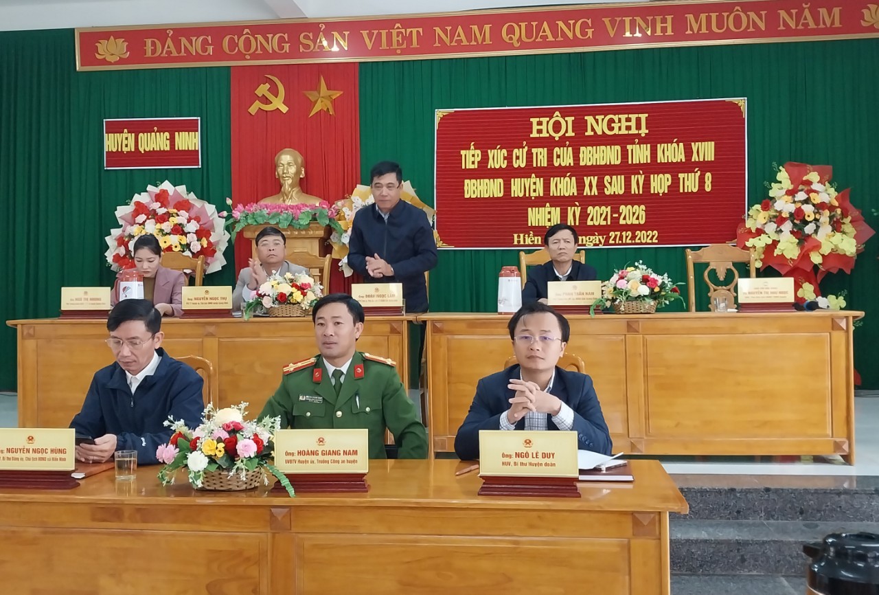 Sau phát biểu khai mạc Hội nghị của đại diện Uỷ ban MTTQVN huyện, ông Phan Trần Nam - đại diện Tổ đại biểu HĐND tỉnh và đại diện Tổ đại biểu HĐND huyện Quảng Ninh đã báo cáo với cử tri về kết quả kỳ họp thứ 8 - HĐND tỉnh khóa XVIII; kết quả kỳ họp thường lệ cuối năm của HĐND huyện Quảng Ninh.