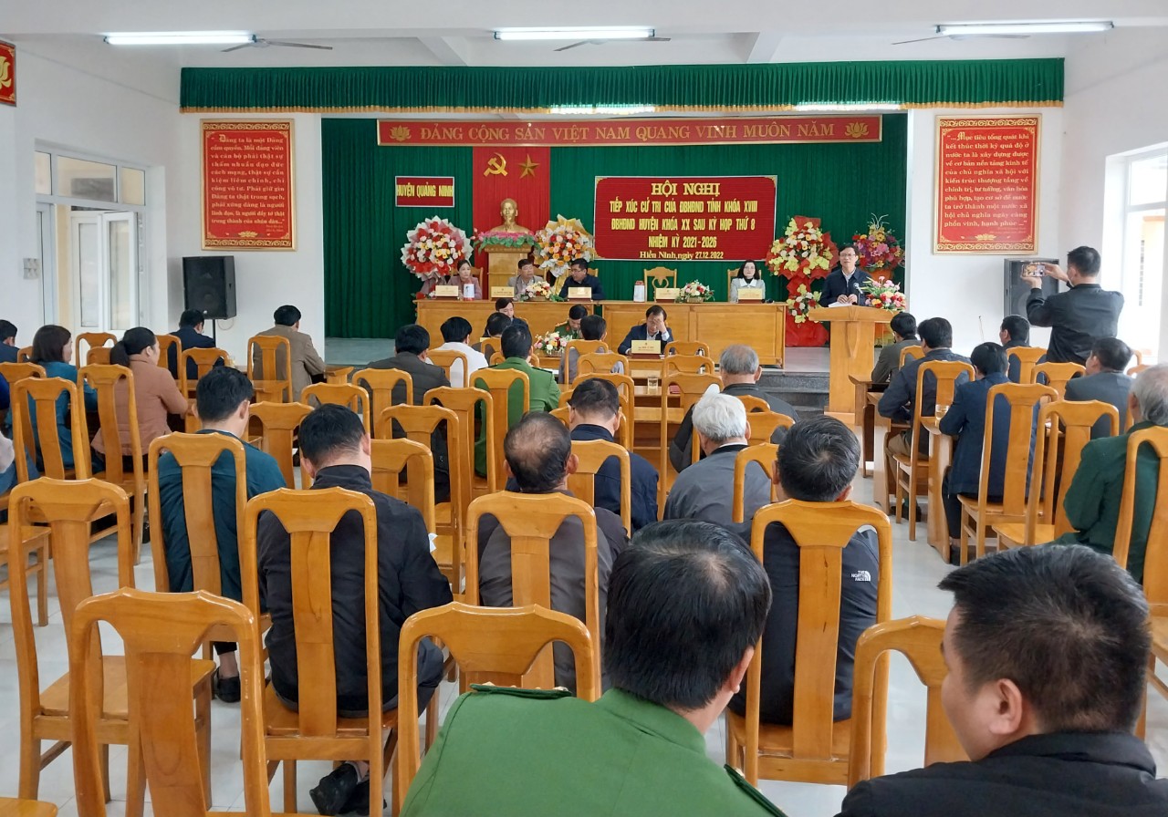Chiều 27/12, tại UBND xã Hiền Ninh, Tổ đại biểu HĐND tỉnh gồm các đại biểu: Đoàn Ngọc Lâm, Ủy viên Ban Thường vụ Tỉnh ủy, Phó Chủ tịch Thường trực UBND tỉnh; Phan Trần Nam, Phó Trưởng Ban Văn hóa - Xã hội HĐND tỉnh; Nguyễn Ngọc Thụ, Phó Bí thư Thường trực Huyện ủy, Chủ tịch HĐND huyện Quảng Ninh và Ngô Thị Nhung, Bác sĩ Trung tâm Y tế huyện Quảng Ninh đã có buổi tiếp xúc với cử tri huyện Quảng Ninh sau kỳ họp thứ 8, HĐND tỉnh khóa XVIII. Tham dự có lãnh đạo các sở, ngành liên quan và chính quyền huyện Quảng Ninh.