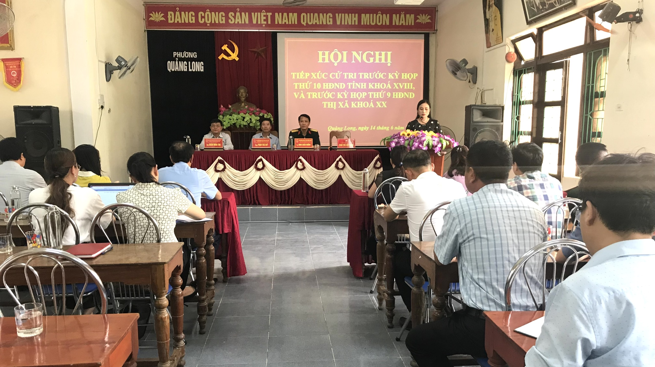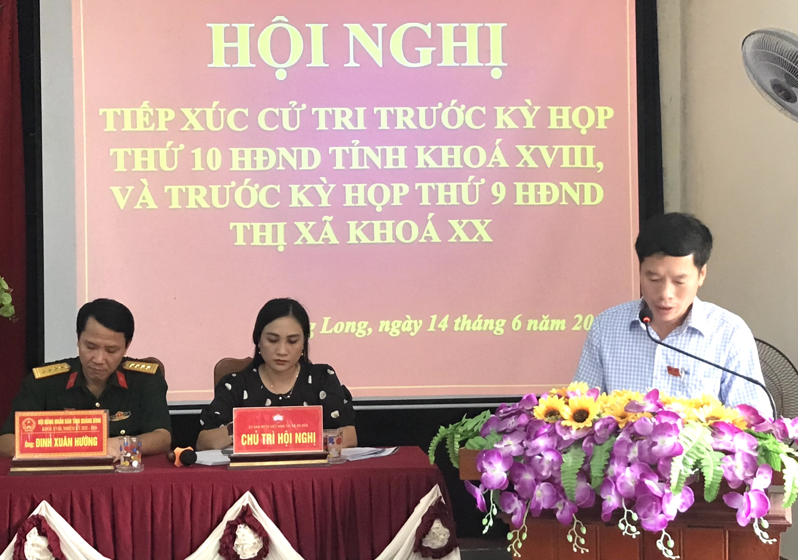 Chiều 14/6/2023, Tổ đại biểu HĐND tỉnh gồm các đại biểu: Ông Đinh Xuân Hướng, Chính ủy, Bộ Chỉ huy quân sự tỉnh; ông Phạm Thái Quý, Phó Trưởng ban Pháp chế HĐND tỉnh đã có buổi tiếp xúc cử tri trước kỳ họp thứ 10 (kỳ họp thường lệ giữa năm 2023, HĐND tỉnh khóa XVIII) tại phường Quảng Long, thị xã Ba Đồn. Tham dự có đại diện lãnh đạo các sở, ban, ngành liên quan; lãnh đạo UBND thị xã Ba Đồn và đại diện các phòng, ban trực thuộc cùng đông đảo cử tri trên địa bàn thị xã.
