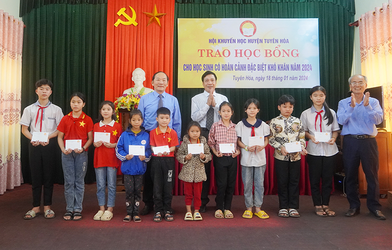 Ngày 18/01/2024, Thường trực HĐND tỉnh và Hội Khuyến học tỉnh tổ chức trao học bổng cho học sinh có hoàn cảnh đặc biệt khó khăn huyện Minh Hóa và huyện Tuyên Hóa. Dự buổi lễ có đồng chí Nguyễn Công Huấn, Ủy viên Ban Thường vụ Tỉnh ủy, Phó Chủ tịch Thường trực HĐND tỉnh; đại điện lãnh đạo Văn phòng Đoàn đại biểu Quốc hội và HĐND tỉnh, Hội Khuyến học tỉnh, đại diện lãnh đạo huyện Minh Hóa và huyện Tuyên Hóa.