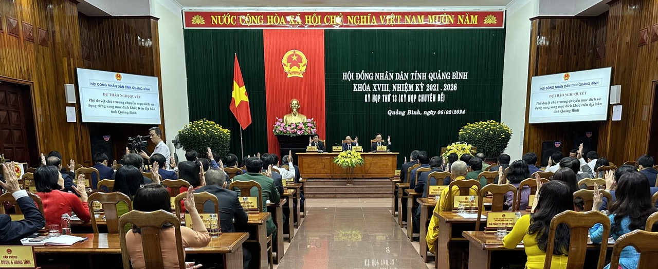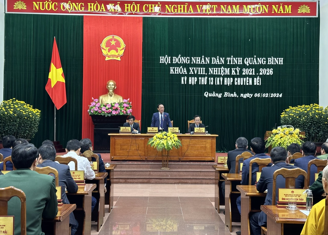 Phát biểu khai mạc kỳ họp thứ 13 (kỳ họp chuyên đề), đồng chí Trần Hải Châu, Phó Bí thư Thường trực Tỉnh ủy, Chủ tịch HĐND tỉnh nêu: Kỳ họp diễn ra trong không khí vui tươi náo nức đón Tết Nguyên đán Giáp Thìn và chào Xuân mới 2024. Cũng trong thời điểm này, các cấp, các ngành đang tổ chức nhiều hoạt động chăm lo Tết cho các gia đình chính sách, người có công, bảo đảm an sinh xã hội; người người, nhà nhà đang háo hức chuẩn bị đón Tết Nguyên đán cổ truyền của dân tộc. Trên cơ sở đề nghị của UBND tỉnh, Thường trực HĐND tỉnh đã quyết định triệu tập Kỳ họp chuyên đề để xem xét, cụ thể hóa những chủ trương, chính sách của Trung ương, của Tỉnh ủy thành những quy định chi tiết, sát thực tế để chính quyền các cấp triển khai thực hiện. Theo đó, tại kỳ họp này, HĐND tỉnh sẽ xem xét, quyết định những nội dung quan trọng như: Xem xét, thông qua dự thảo Nghị quyết về quy định về học phí học kỳ II năm học 2023 - 2024 trên địa bàn tỉnh Quảng Bình; dự thảo Nghị quyết phê duyệt chủ trương đầu tư dự án “Sửa chữa trụ sở làm việc Sở Thông tin và Truyền thông”; dự thảo Nghị quyết Phê duyệt chủ trương chuyển mục đích sử dụng rừng sang mục đích khác trên địa bàn tỉnh Quảng Bình; xem xét, quyết định công tác nhân sự.