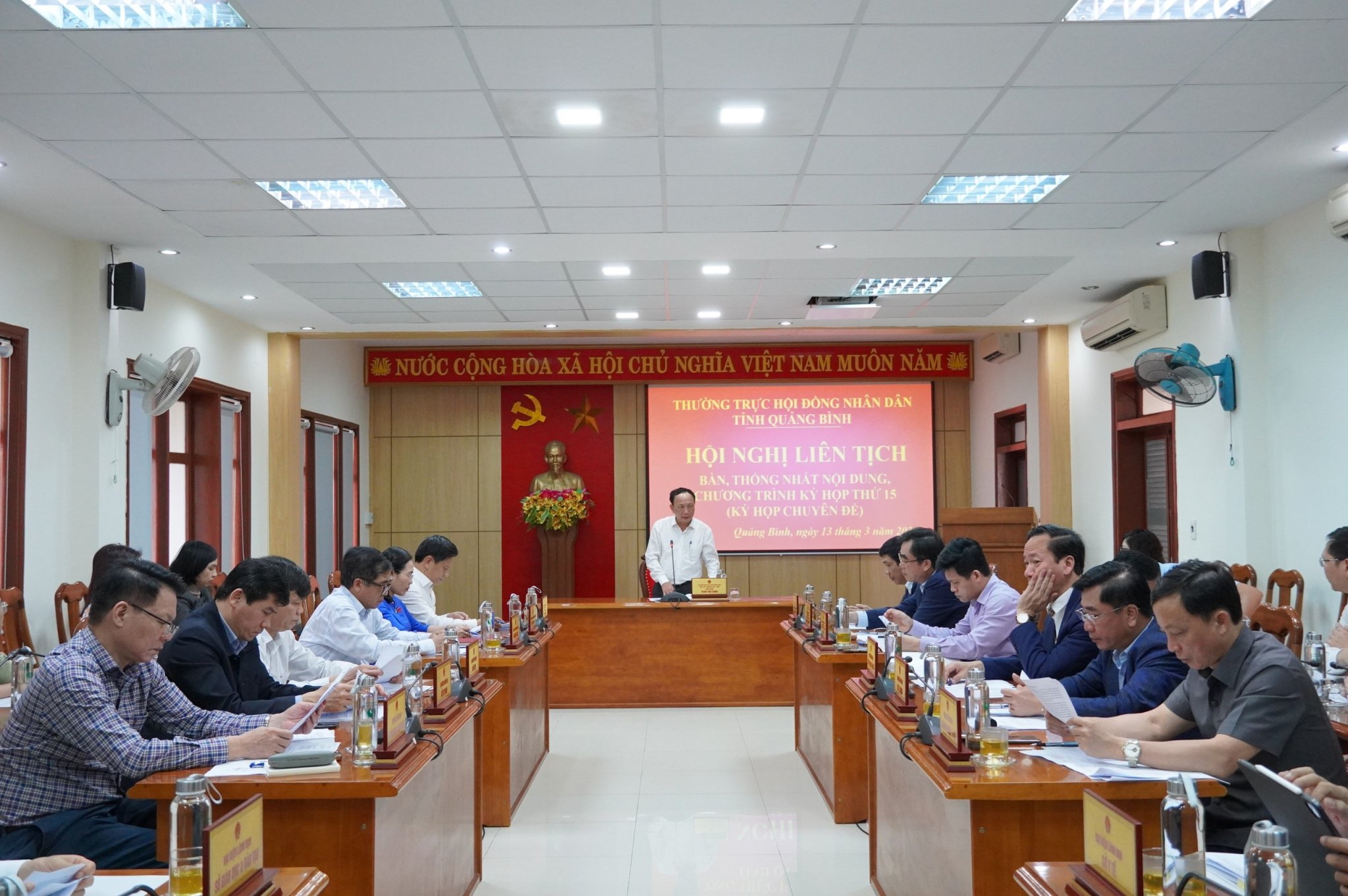 Chiều ngày 13/3/2024, Thường trực HĐND tỉnh tổ chức Hội nghị liên tịch thống nhất nội dung, chương trình tổ chức kỳ họp thứ 15 (kỳ họp chuyên đề) của HĐND tỉnh khóa XVIII, nhiệm kỳ 2021 - 2026. Đồng chí Trần Hải Châu, Phó Bí thư Thường trực Tỉnh ủy, Chủ tịch HĐND tỉnh chủ trì hội nghị. Tham dự có đồng chí Nguyễn Công Huấn - Ủy viên Ban Thường vụ Tỉnh ủy, Phó Chủ tịch Thường trực HĐND tỉnh cùng các đồng chí trong Thường trực HĐND tỉnh; đại diện lãnh đạo UBND tỉnh, Ủy ban Mặt trận Tổ quốc Việt Nam tỉnh; lãnh đạo các Ban của HĐND tỉnh, Văn phòng Đoàn ĐBQH và HĐND tỉnh; đại diện lãnh đạo Văn phòng Tỉnh ủy, Văn phòng UBND tỉnh và các sở, ban, ngành liên quan.