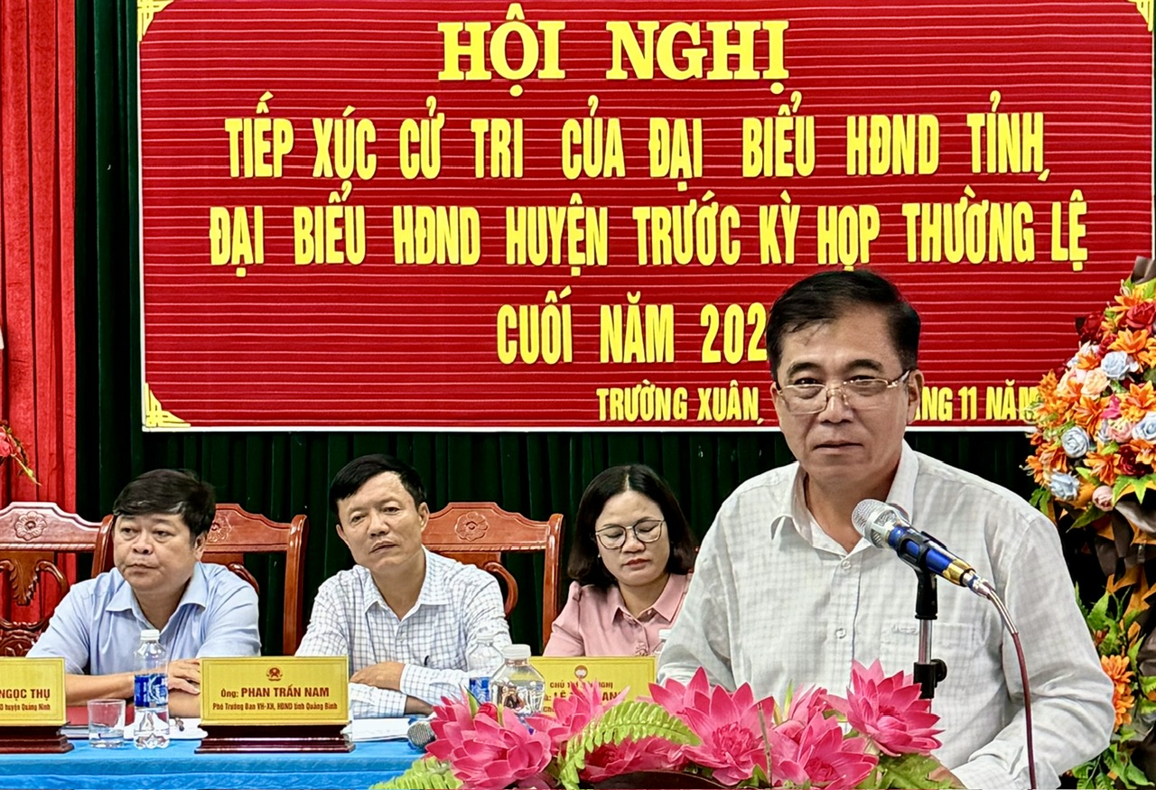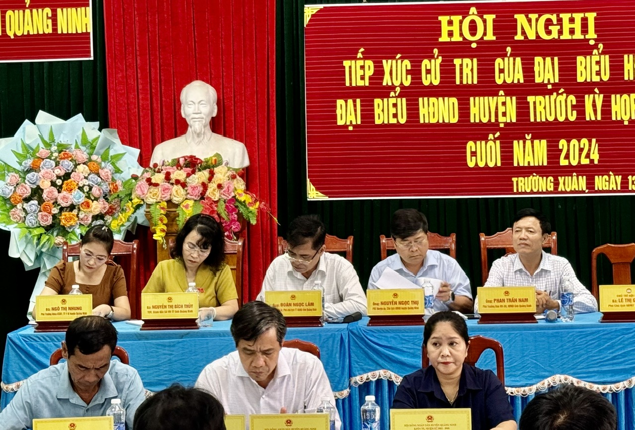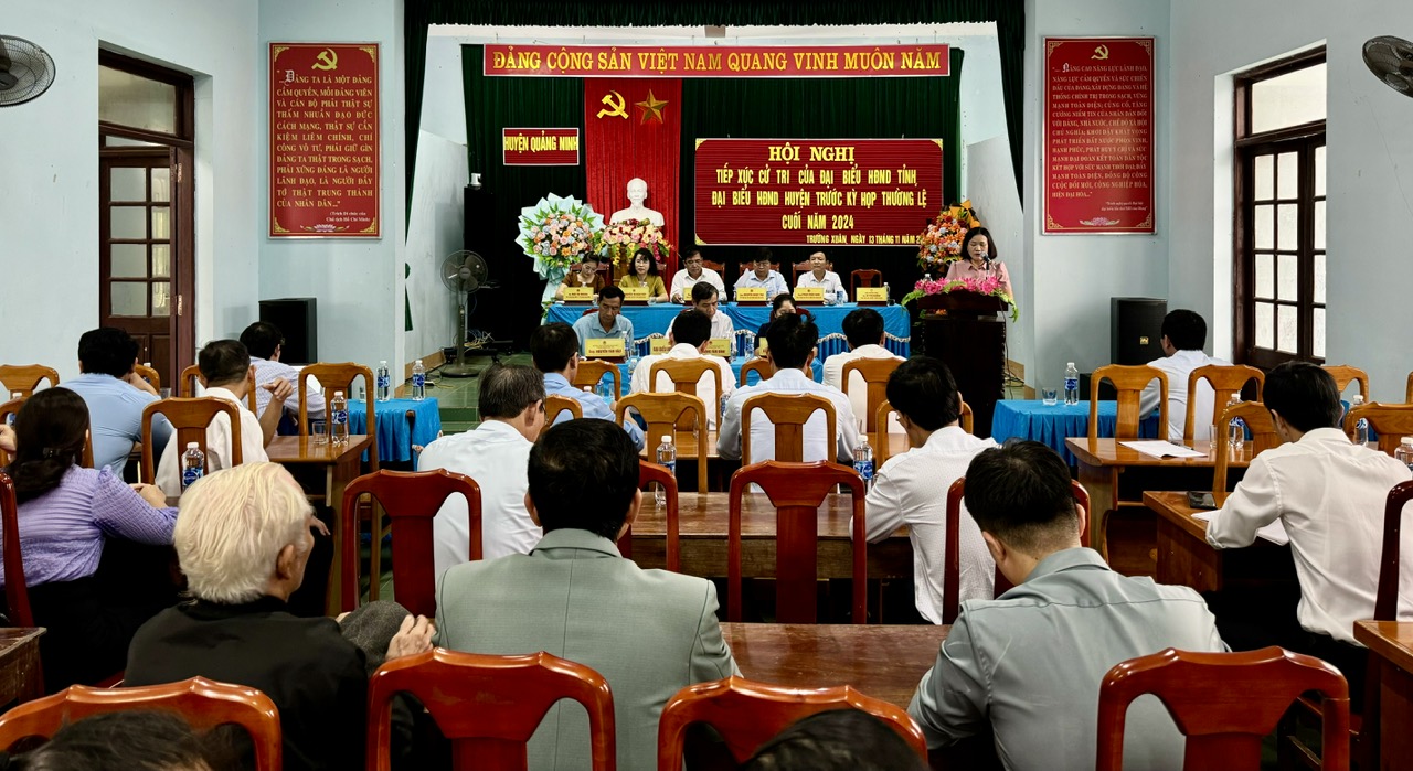 Chiều ngày 13/11, tại trụ sở UBND xã Trường Xuân, huyện Quảng Ninh, Tổ đại biểu HĐND tỉnh gồm các đại biểu: ông Đoàn Ngọc Lâm, Ủy viên Ban Thường vụ Tỉnh ủy, Phó Chủ tịch Thường trực UBND tỉnh; ông Nguyễn Ngọc Thụ, Chủ tịch UBND huyện Quảng Ninh; bà Nguyễn Thị Bích Thủy, Giám đốc Sở Văn hoá và Thể thao; ông Phan Trần Nam, Phó Trưởng Ban Văn hóa - Xã hội, HĐND tỉnh; bà Ngô Thị Nhung, Trung tâm Y tế huyện Quảng Ninh đã có buổi tiếp xúc cử tri huyện Quảng Ninh trước kỳ họp thứ 19 (kỳ họp thường lệ cuối năm 2024), HĐND tỉnh khóa XVIII. Dự buổi tiếp xúc có đại diện lãnh đạo một số sở, ngành liên quan, đại diện Thường trực HĐND, UBND, Ủy ban MTTQVN huyện Quảng Ninh và cử tri trên địa bàn.
