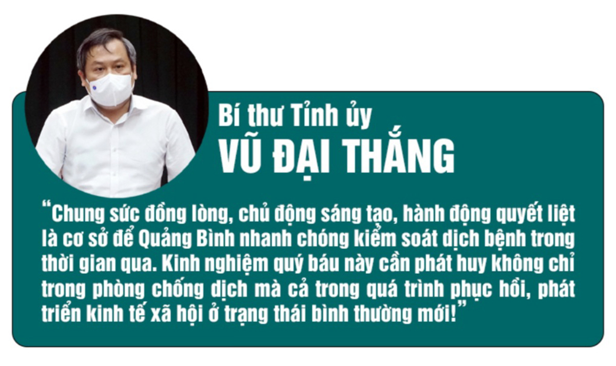 Chiến dịch thần tốc test nhanh, xét nghiệm RT-PCR được triển khai. Viện Pasteur đã cử đoàn cán bộ hỗ trợ Quảng Bình đẩy nhanh công tác xét nghiệm, sàng lọc, bóc tách F0 trong cộng đồng. Ban Chỉ đạo, Trung tâm chỉ huy các cấp kích hoạt chế độ “trực chiến” 24/24h.