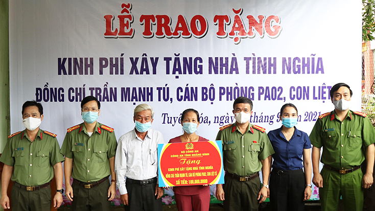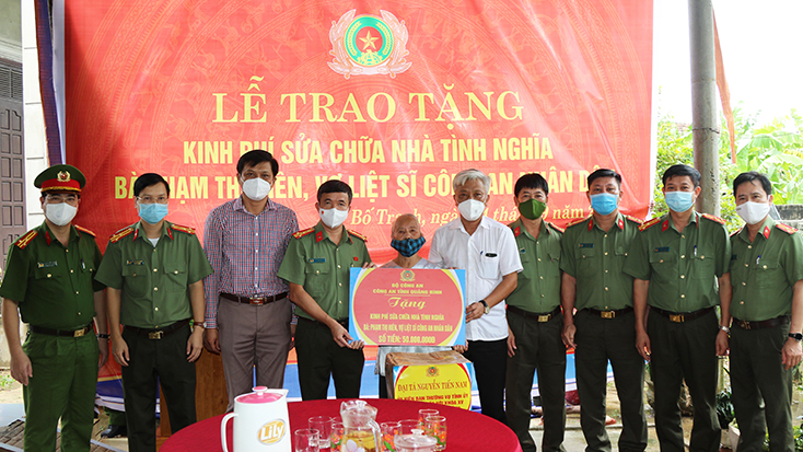 Thăm gia đình bà Phạm Thị Hiên, vợ Anh hùng liệt sỹ Công an nhân dân Phạm Viết Cù hiện đang sinh sống tại xã Trung trạch, huyện Bố Trạch, đồng chí Giám đốc Công an tỉnh trao số tiền 50 triệu đồng để hỗ trợ gia đình sửa chữa lại căn nhà tình nghĩa được Bộ Công an cấp kinh phí xây dựng từ năm 2007 đã bị hư hỏng, xuống cấp.