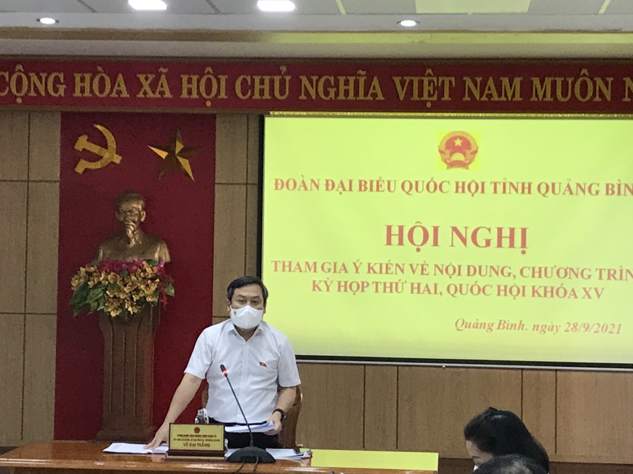 Ngày 28/9/2021, Đoàn ĐBQH tỉnh Quảng Bình tổ chức hội nghị họp Đoàn lấy ý kiến tham gia vào nội dung, chương trình kỳ họp thứ hai, Quốc hội khóa XV và thống nhất một số nội dung chuẩn bị cho kỳ họp dưới sự chủ trì của đồng chí Vũ Đại Thắng - UVBCHTƯ Đảng, Bí thư Tỉnh ủy, Trưởng Đoàn đại biểu Quốc hội tỉnh.