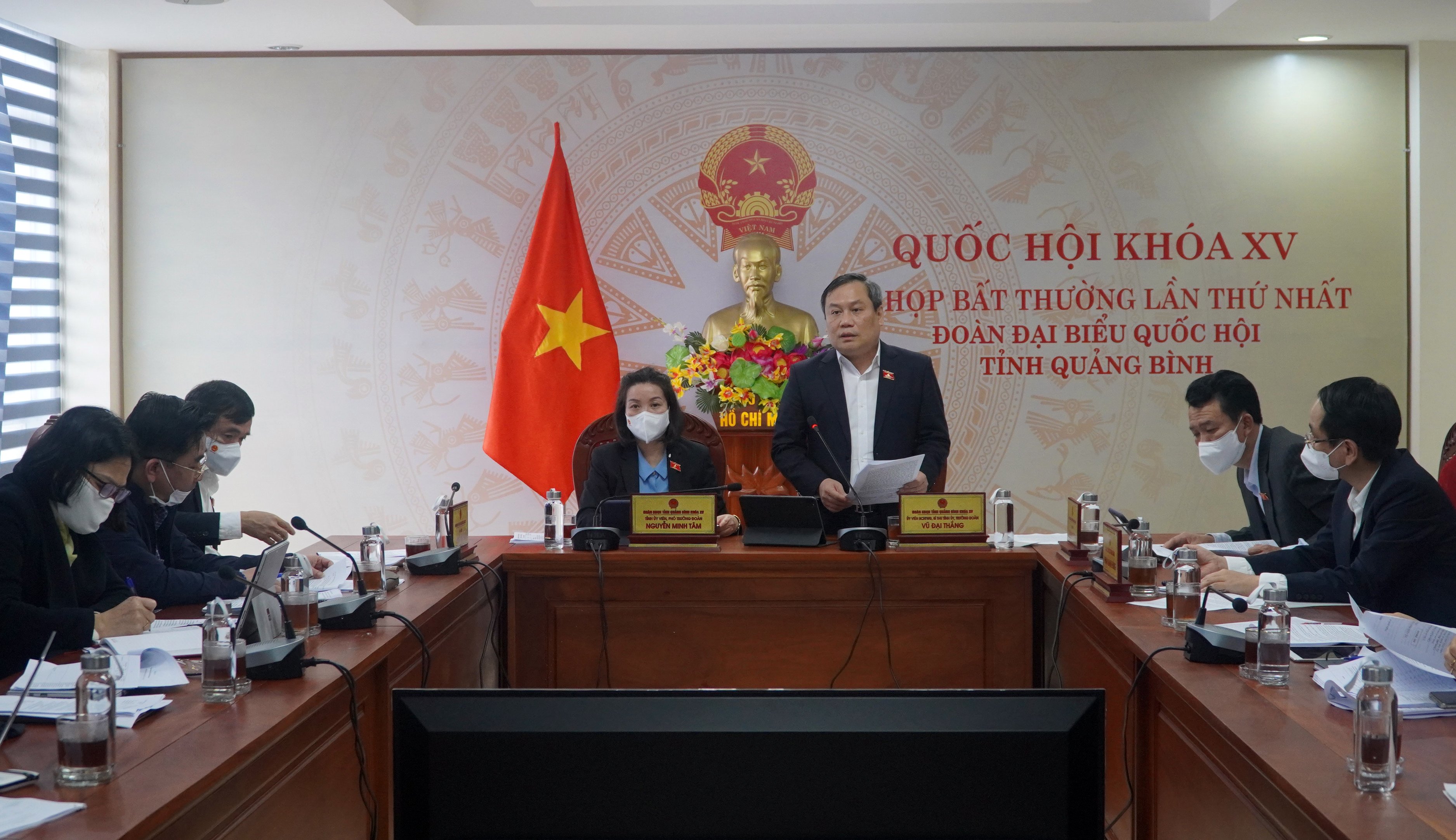 Chiều ngày 04/01/2022, tiếp tục chương trình kỳ họp bất thường lần thứ nhất, Quốc hội khoá XV, Đoàn ĐBQH tỉnh Quảng Bình thảo luận tại tổ về chính sách tài khoá, tiền tệ hỗ trợ triển khai Chương trình phục hồi và phát triển kinh tế - xã hội. Đồng chí Vũ Đại Thắng, Ủy viên Trung ương Đảng, Bí thư Tỉnh ủy, Trưởng đoàn Đại biểu Quốc hội tỉnh; Nguyễn Minh Tâm, Tỉnh ủy viên, Phó trưởng đoàn ĐBQH điều hành.Tham dự phiên họp có các ĐBQH: Nguyễn Tiến Nam, Trần Quang Minh; đồng chí Phan Mạnh Hùng, Phó Chủ tịch UBND tỉnh; đại diện lãnh đạo các sở, ban, ngành.Tại phiên thảo luận, đồng chí Bí thư Tỉnh ủy, Trưởng đoàn ĐBQH Vũ Đại Thắng đã giới thiệu về Dự thảo Nghị quyết về giải pháp tài khóa, tiền tệ để hỗ trợ chương trình phục hồi và phát triển KT-XH.