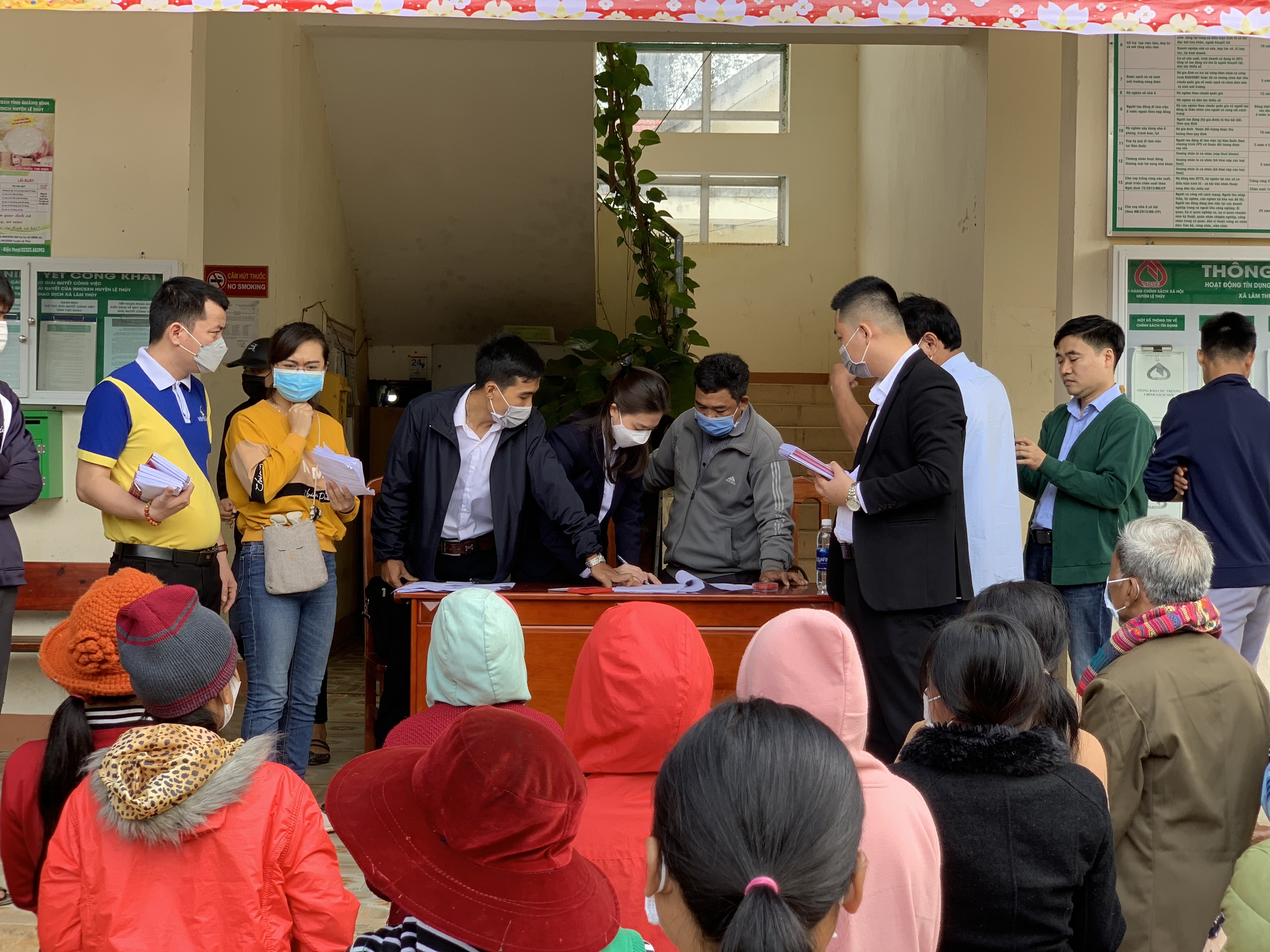 Bà con làm thủ tục nhận các phần quà