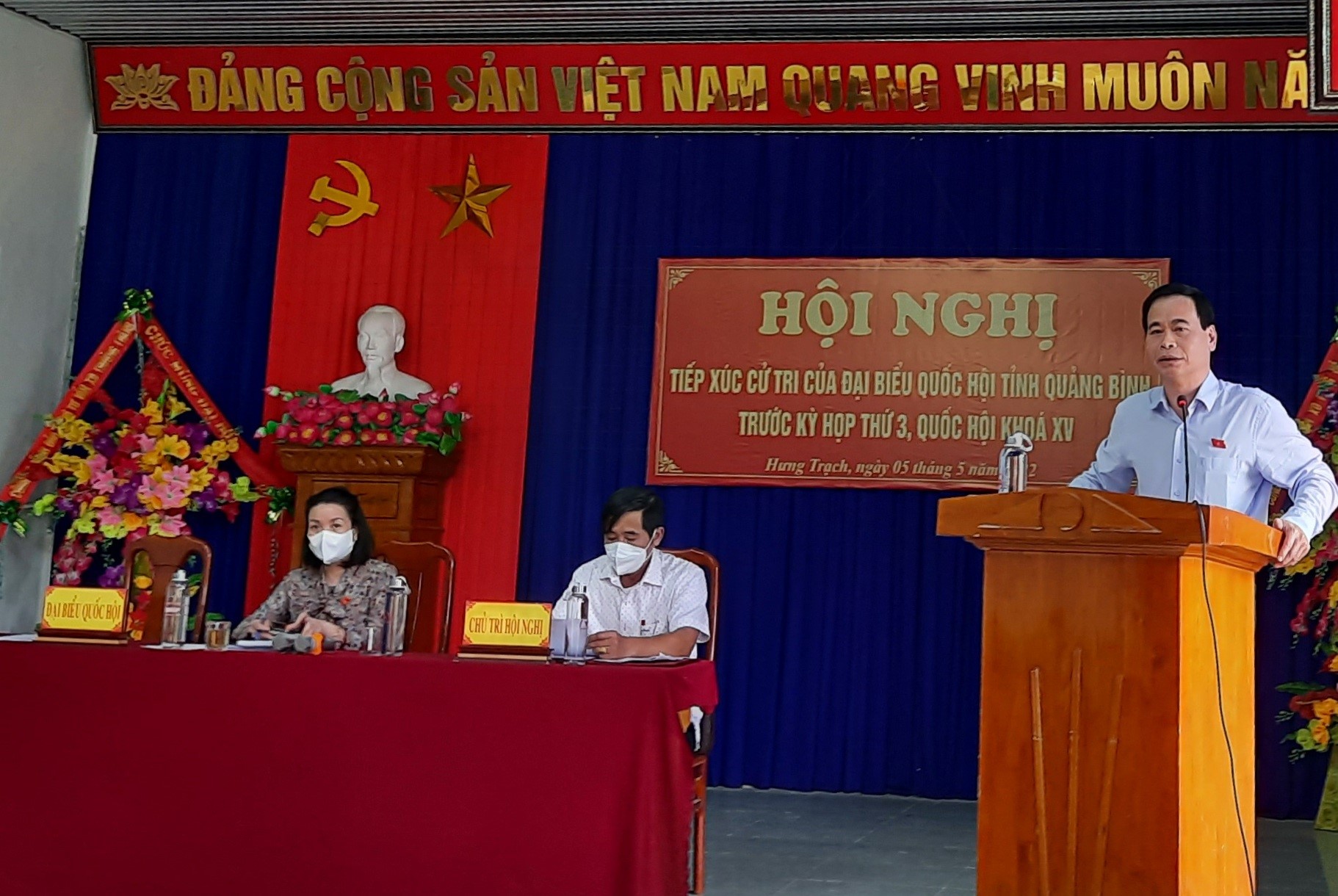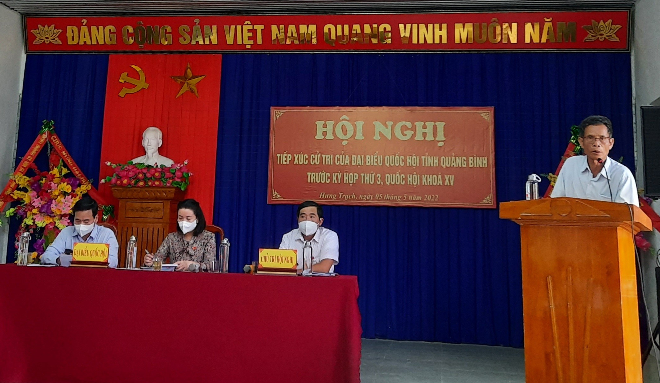 Sau khi nghe ĐBQH báo cáo, cử tri huyện Bố Trạch bày tỏ sự đồng tình với những nội dung quan trọng mà Quốc hội sẽ xem xét, quyết định tại kỳ họp tới; đồng thời kiến nghị một số nội dung: đề nghị rà soát, đẩy nhanh tiến độ cầu vượt lũ tại xã Hưng Trạch; quan tâm hỗ trợ kinh phí đối với các địa phương chưa hoàn thành chương trình mục tiêu quốc gia xây dựng nông thôn mới; quan tâm phát triển du lịch ở xã Hưng Trạch, tạo việc làm cho nhân dân; hỗ trợ để hoàn thiện tuyến đường từ Phúc Trạch đi Liên Trạch; tăng mức phụ cấp đối với cán bộ thôn, bản, đặc biệt ở những địa bàn phức tạp; có chính sách ưu tiên cho người dân địa phương trong vấn đề đất ở; tạo điều kiện cho người dân phát triển rừng sản xuất, có chính sách ưu đãi để người dân chăm sóc, bảo vệ rừng vùng đệm;…