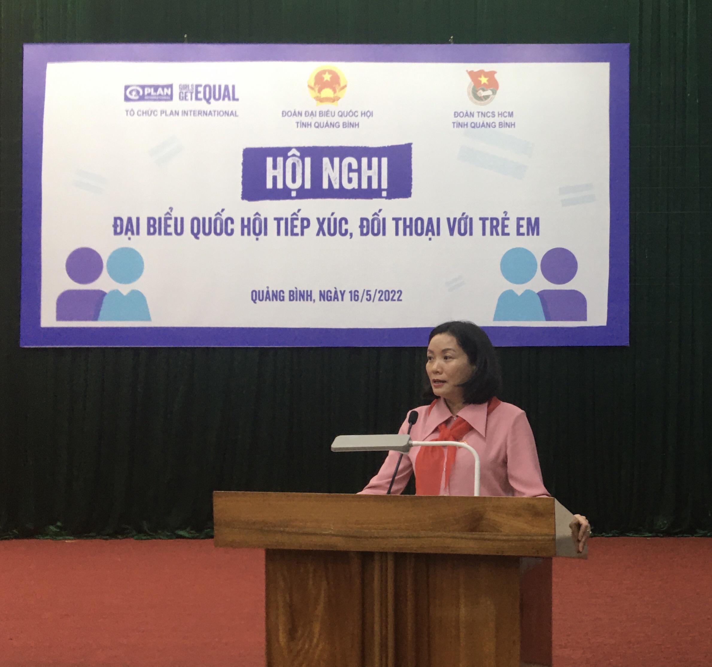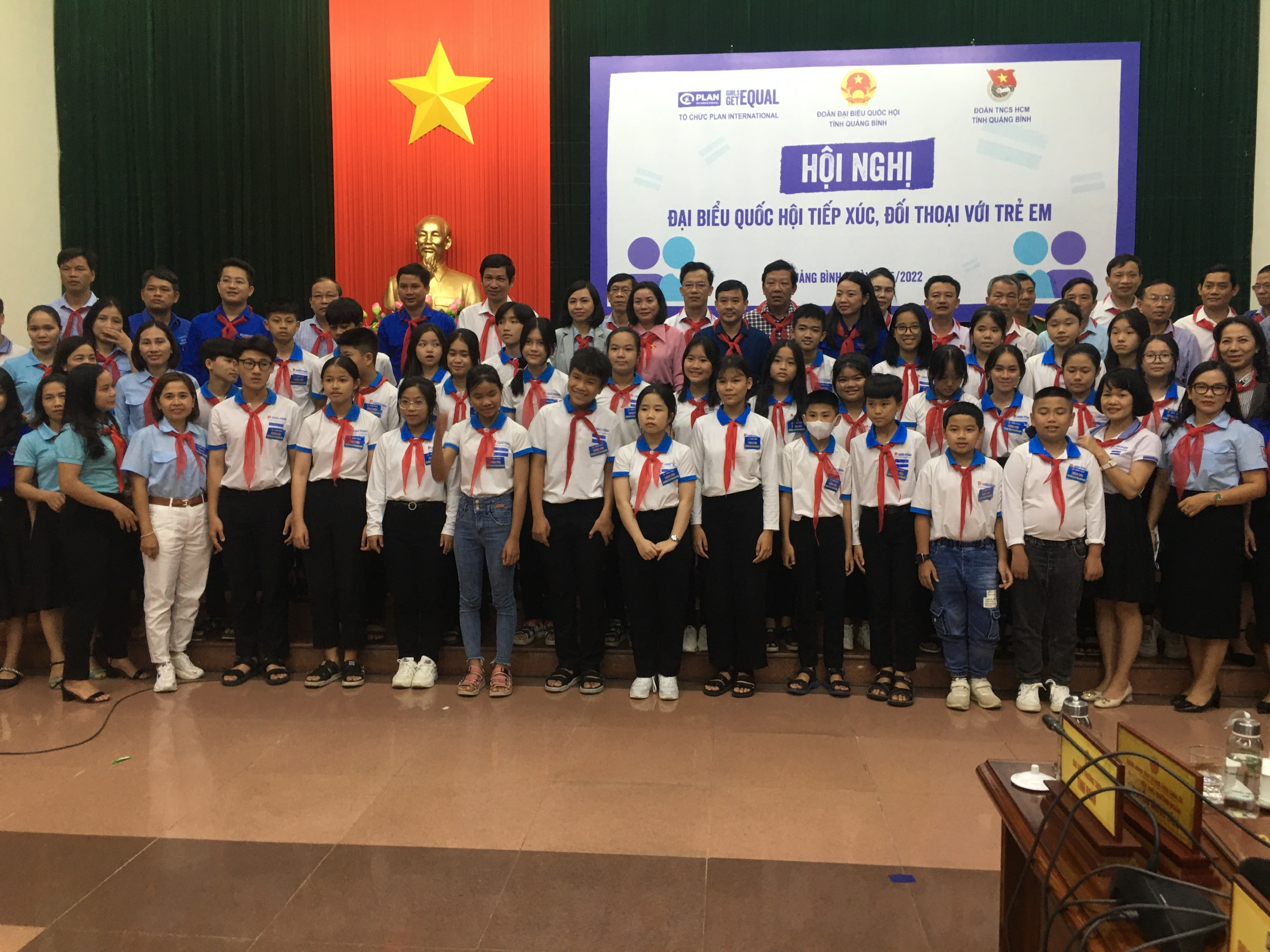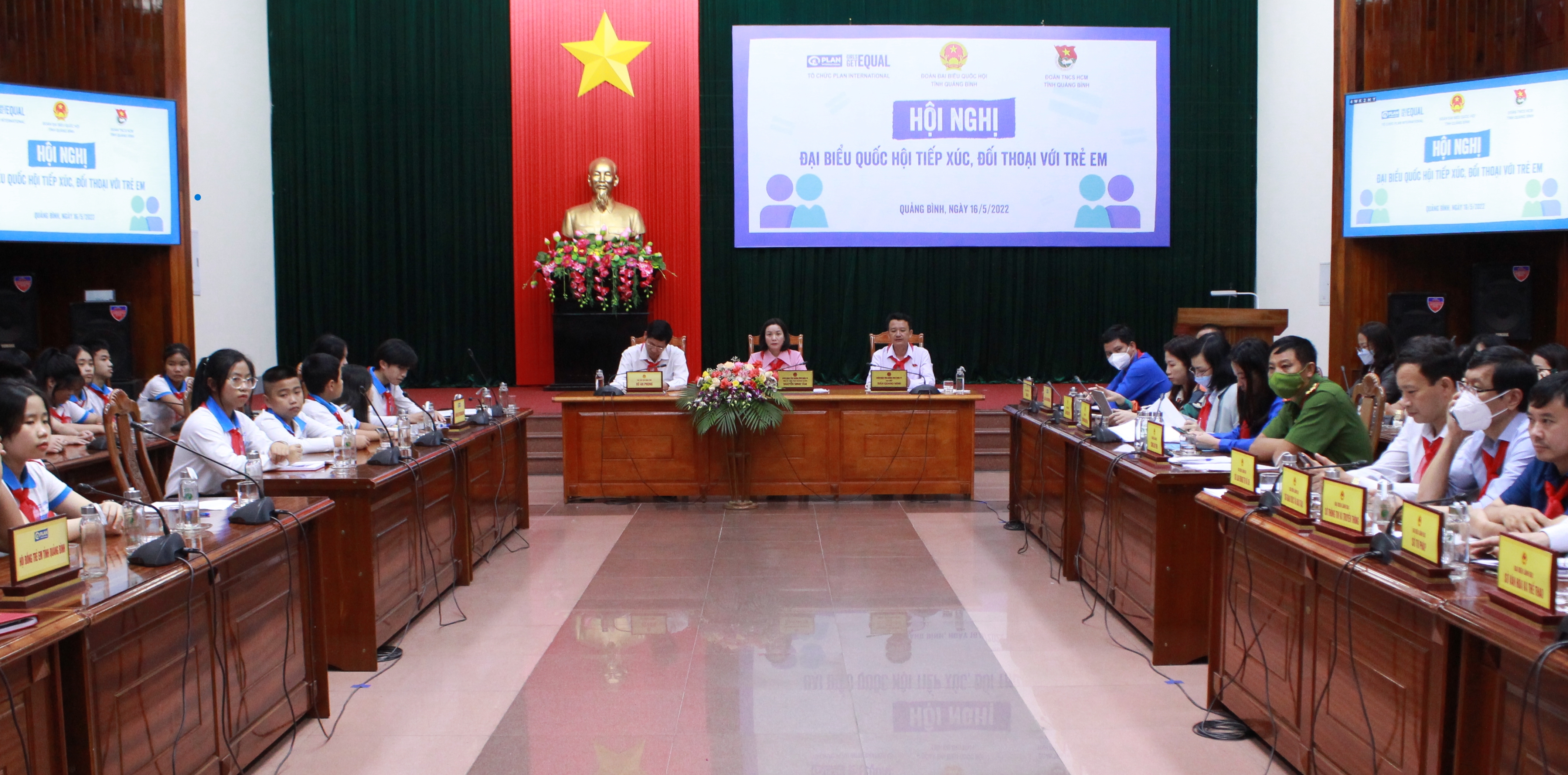 Sáng ngày 16/5/2022, tại Hội trường Ủy ban nhân dân tỉnh, Đoàn ĐBQH tỉnh phối hợp với Tổ chức Plan Việt Nam tại Quảng Bình và Ban Thường vụ Tỉnh đoàn tổ chức Hội nghị đại biểu Quốc hội tiếp xúc, đối thoại với trẻ em tỉnh Quảng Bình để lắng nghe tâm tư, nguyện vọng, kiến nghị của trẻ em. Các đồng chí: Nguyễn Minh Tâm, Phó Trưởng Đoàn đại biểu Quốc hội tỉnh; Trần Quang Minh, đại biểu Quốc hội tỉnh; Hồ An Phong, Phó Chủ tịch UBND tỉnh đồng Chủ trì Hội nghị. Tham dự Hội nghị có đại diện lãnh đạo các sở, ban, ngành, địa phương liên quan, Thường trực Tỉnh Đoàn, lãnh đạo Tổ chức Plan International Việt Nam tại Quảng Bình; đặc biệt là sự có mặt của các thành viên Hội đồng trẻ em và các em học sinh đại diện cho một số trường học trên địa bàn tỉnh.