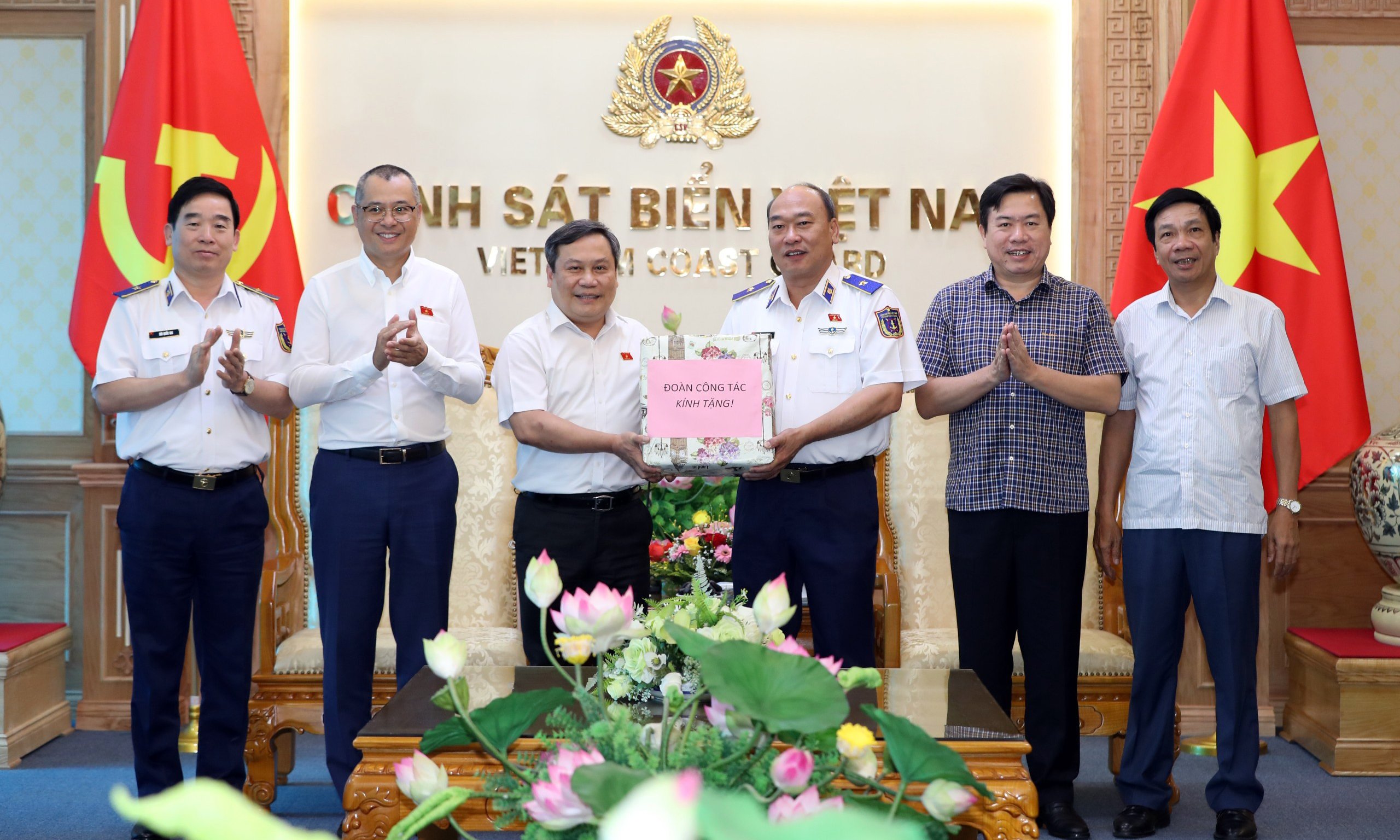 Thay mặt Tổ ĐBQH số 5, đồng chí Vũ Đại Thắng trân trọng gửi lời cảm ơn, tình cảm gắn bó và sự tin cậy của cán bộ, nhân dân, đặc biệt là ngư dân đến cán bộ, chiến sĩ lực lượng cảnh sát biển, chúc các đồng chí vững tay súng, hoàn thành xuất sắc nhiệm vụ được giao, giữ gìn toàn vẹn chủ quyền biển, đảo Tổ quốc, luôn là điểm tựa vững chắc của ngư dân.