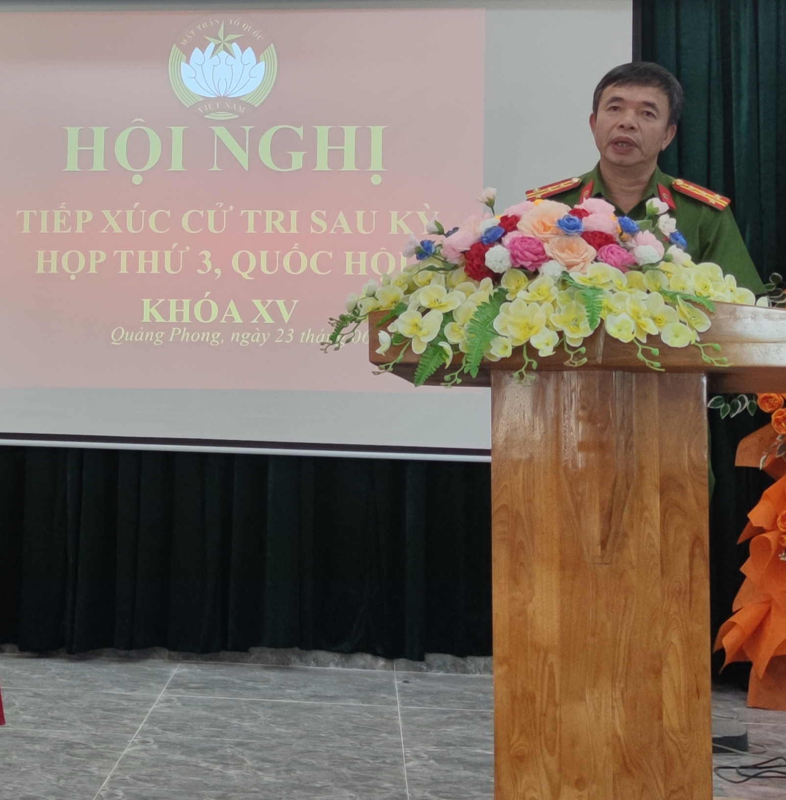 Sáng ngày 23-6, Đoàn đại biểu Quốc hội tỉnh gồm các đại biểu: ông Nguyễn Tiến Nam, Viện trưởng Viện khoa học hình sự Bộ Công an; Bà Nguyễn Thị Tuyết Nga, Ủy viên chuyên trách Ủy ban Văn hóa, Giáo dục của Quốc hội khóa XV; Ông Trần Quang Minh, Phó Chủ tịch Ủy ban MTTQVN tỉnh. Tham gia hội nghị có ông Trương An Ninh- Ủy viên BTV Tỉnh ủy, Bí thư Thị ủy Ba Đồn, ông Đoàn Minh Thọ, Chủ tịch UBND thị xã có buổi tiếp xúc với cử tri tại phường Quảng Phong, thị xã Ba Đồn.