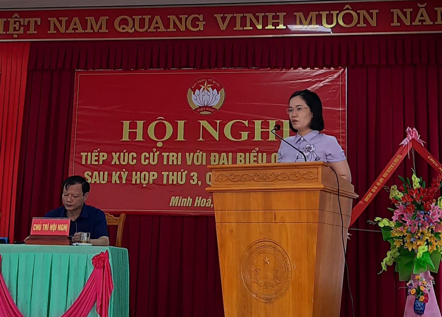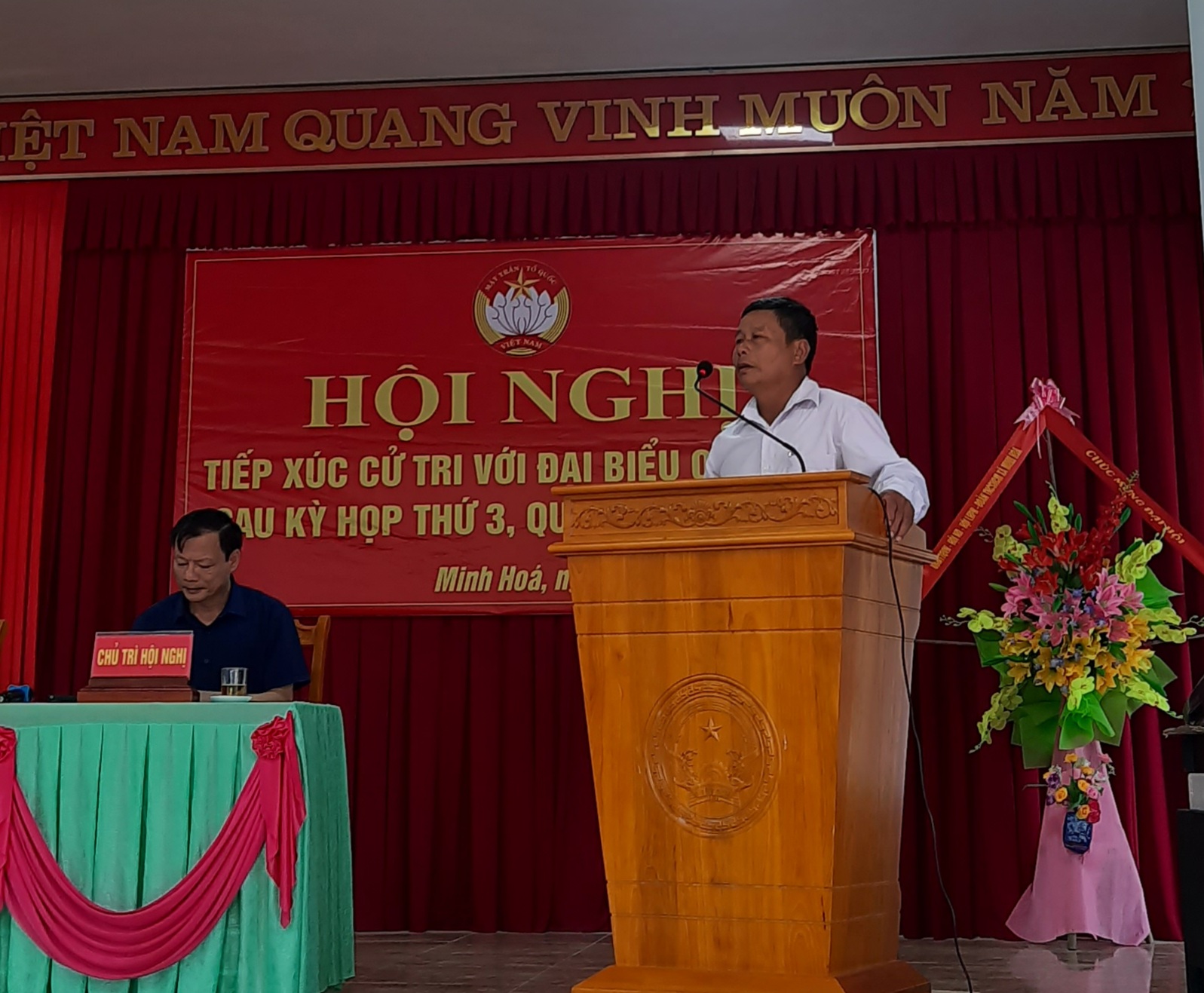 Tại buổi tiếp xúc, cử tri huyện Minh Hóa đã có 05 lượt ý kiến liên quan đến các vấn đề như: đề nghị xem xét nâng mức phụ cấp đối với người hoạt động không chuyên trách ở thôn, tổ dân phố; quan tâm giải quyết chế độ, chính sách cho người có công, tăng mức hỗ trợ làm nhà ở, hỗ trợ cho con liệt sỹ có hoàn cảnh đặc biệt khó khăn; giải quyết dứt điểm về ranh giới hành chính giữa thị trấn Quy Đạt và xã Minh Hóa;…