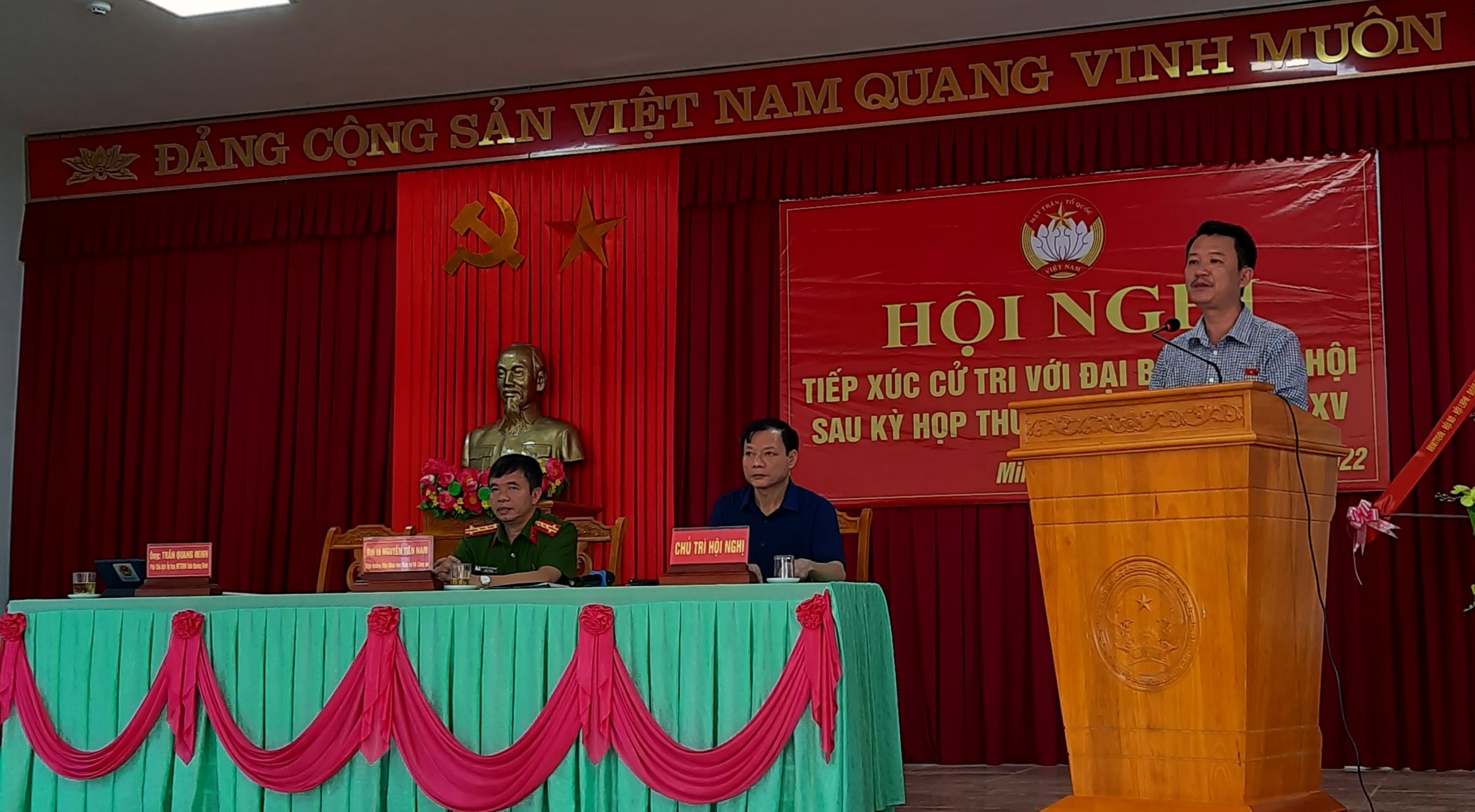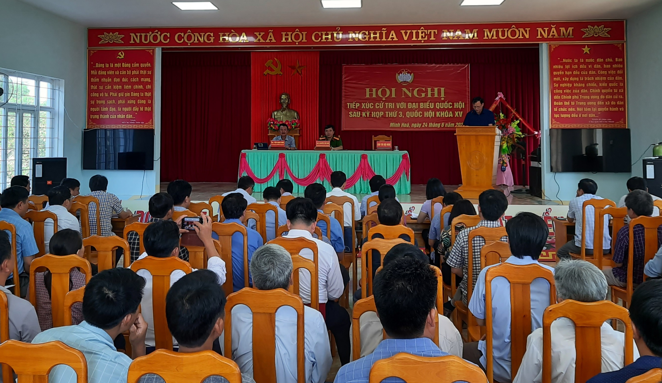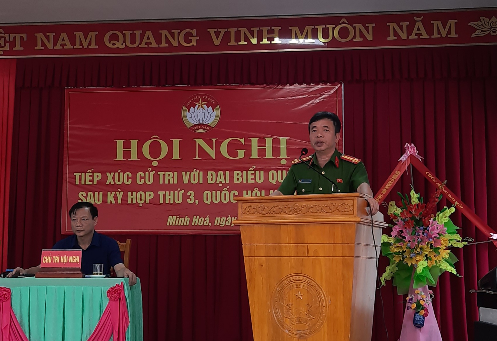 Sáng ngày 24/6/2022, tại xã Minh Hóa, các vị ĐBQH thuộc Đoàn đại biểu Quốc hội tỉnh Quảng Bình gồm: Ông Nguyễn Tiến Nam, Viện trưởng Viện khoa học hình sự Bộ Công an; Ông Trần Quang Minh, Phó Chủ tịch Ủy ban MTTQVN tỉnh đã có buổi tiếp xúc với cử tri huyện Minh Hóa sau kỳ họp thứ 3, Quốc hội khóa XV.
