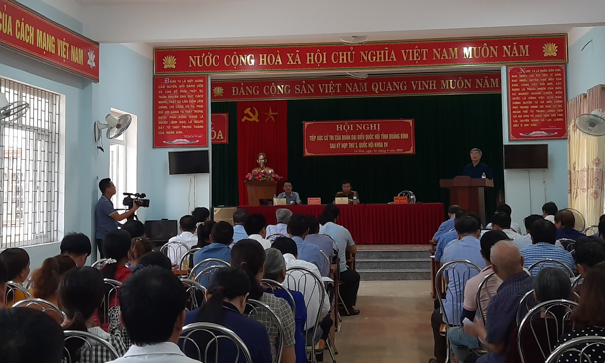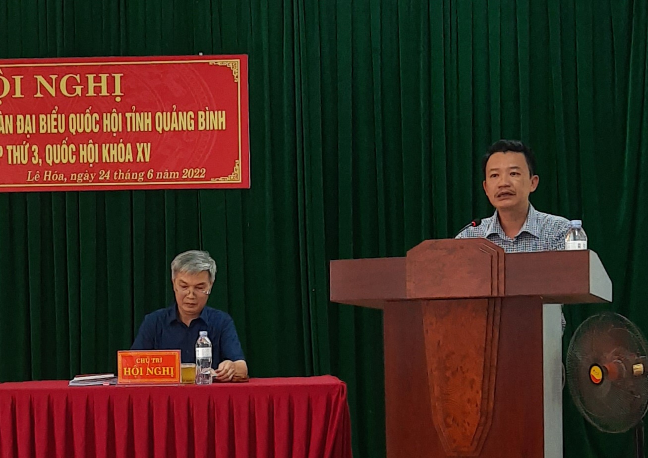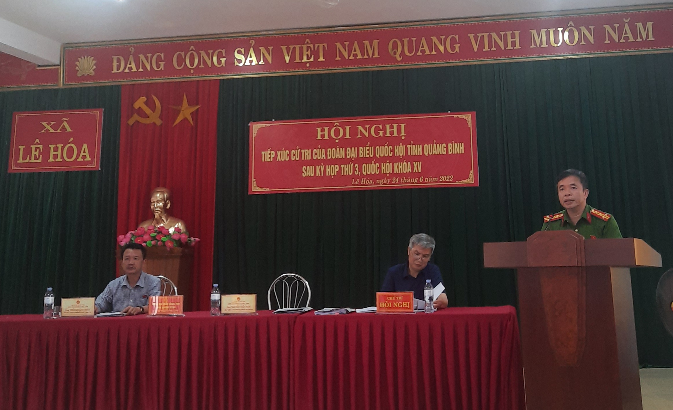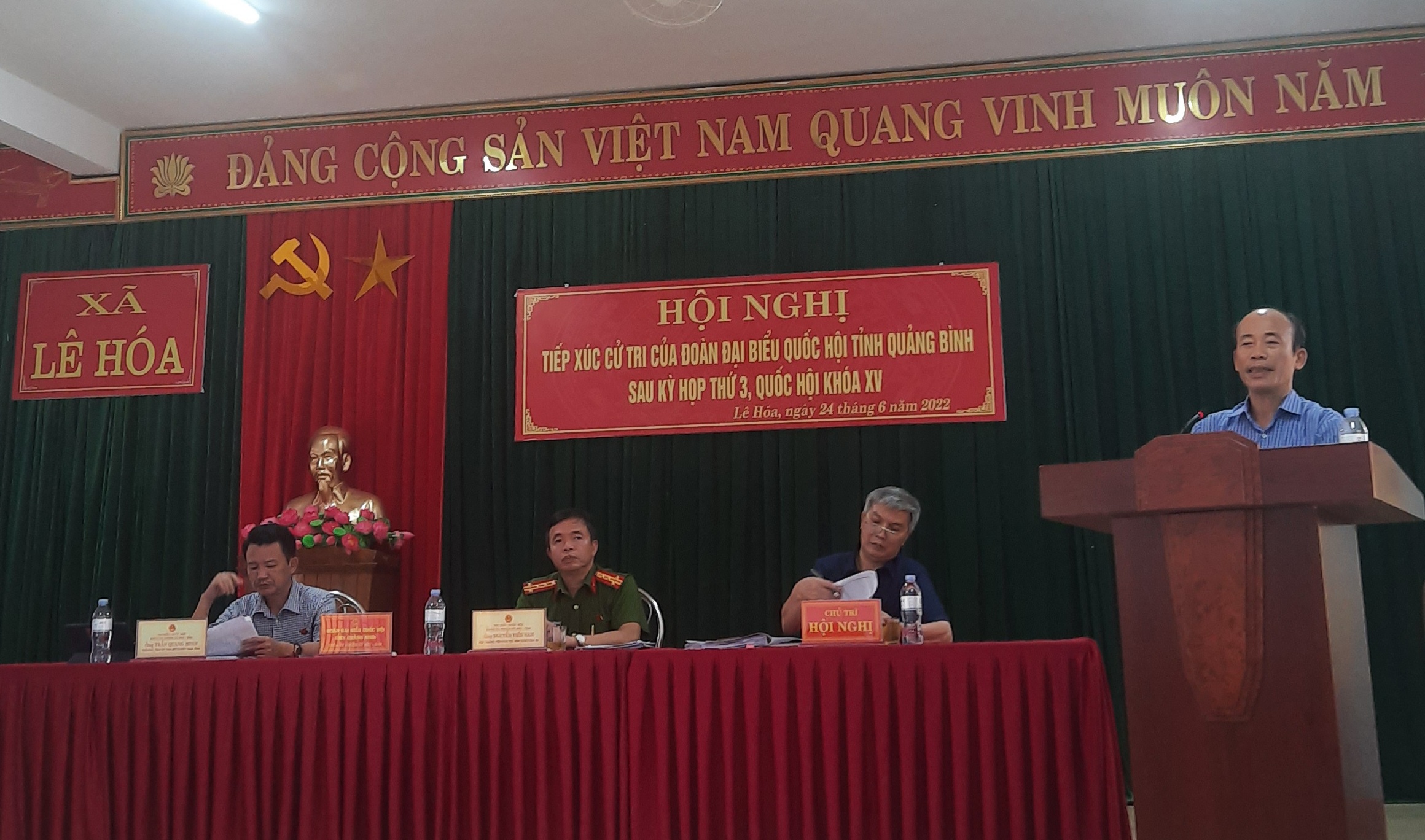 Chiều ngày 24/6/2022, tại Hội trường UBND xã Lê Hóa, các vị ĐBQH thuộc Đoàn đại biểu Quốc hội tỉnh Quảng Bình gồm: Ông Nguyễn Tiến Nam, Viện trưởng Viện khoa học hình sự Bộ Công an; Ông Trần Quang Minh, Phó Chủ tịch Ủy ban MTTQVN tỉnh đã có buổi tiếp xúc với cử tri huyện Tuyên Hóa sau kỳ họp thứ 3, Quốc hội khóa XV. Tham dự buổi tiếp xúc cử tri có đại diện lãnh đạo một số sở, ban, ngành và đông đảo cử tri trên địa bàn.