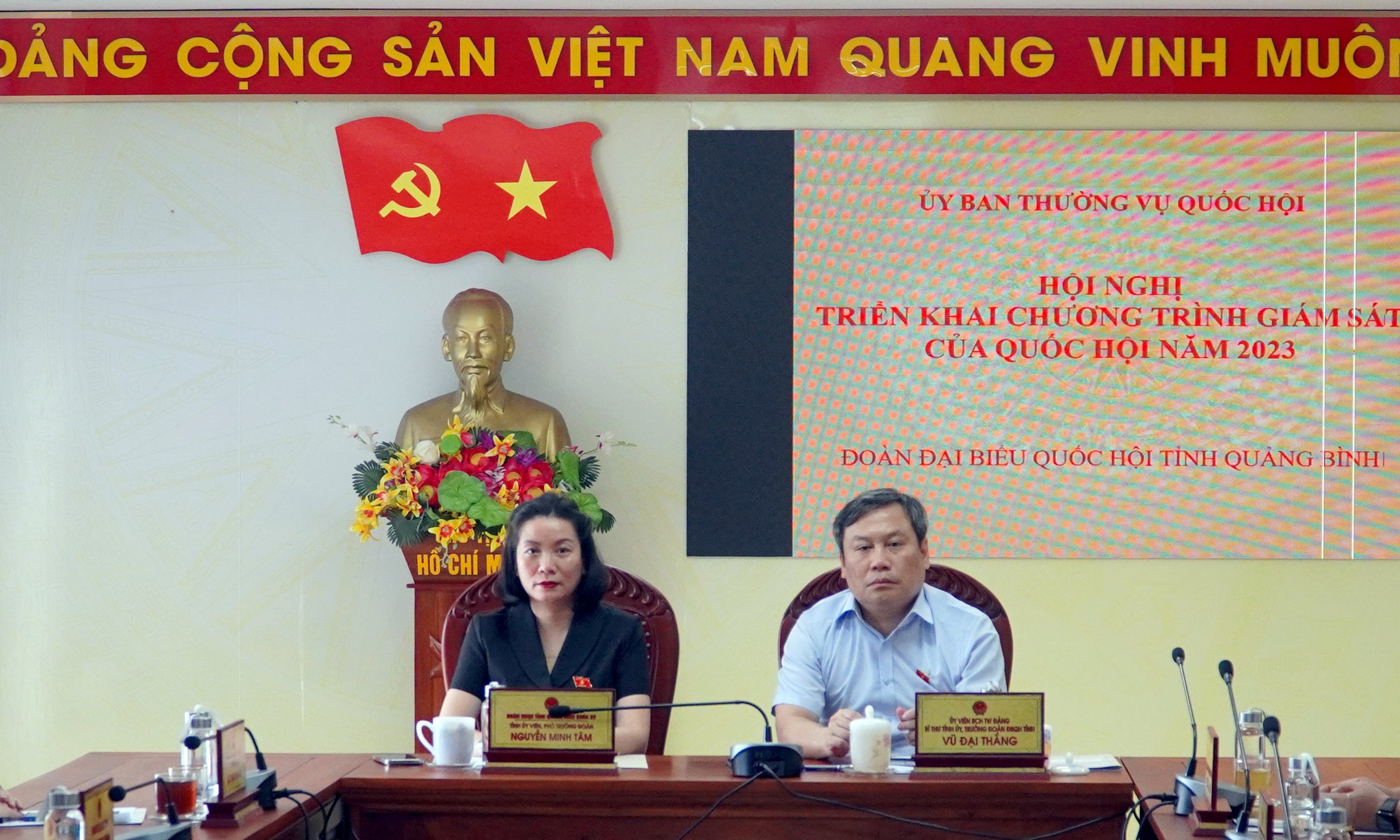 Sáng nay, 27/9/2022, tại thủ đô Hà Nội, Ủy viên Bộ Chính trị, Chủ tịch Quốc hội Vương Đình Huệ đã chủ trì hội nghị triển khai Chương trình giám sát của Quốc hội năm 2023. Hội nghị được tổ chức trực tiếp và trực tuyến, kết nối với 49 điểm cầu của các Đoàn Đại biểu Quốc hội (ĐBQH) trong cả nước. Chủ trì tại điểm cầu tỉnh Quảng Bình có đồng chí Vũ Đại Thắng, Ủy viên Trung ương Đảng, Bí thư Tỉnh ủy, Trưởng đoàn ĐBQH tỉnh; Nguyễn Minh Tâm, Tỉnh ủy viên, Phó trưởng đoàn chuyên trách Đoàn ĐBQH tỉnh.