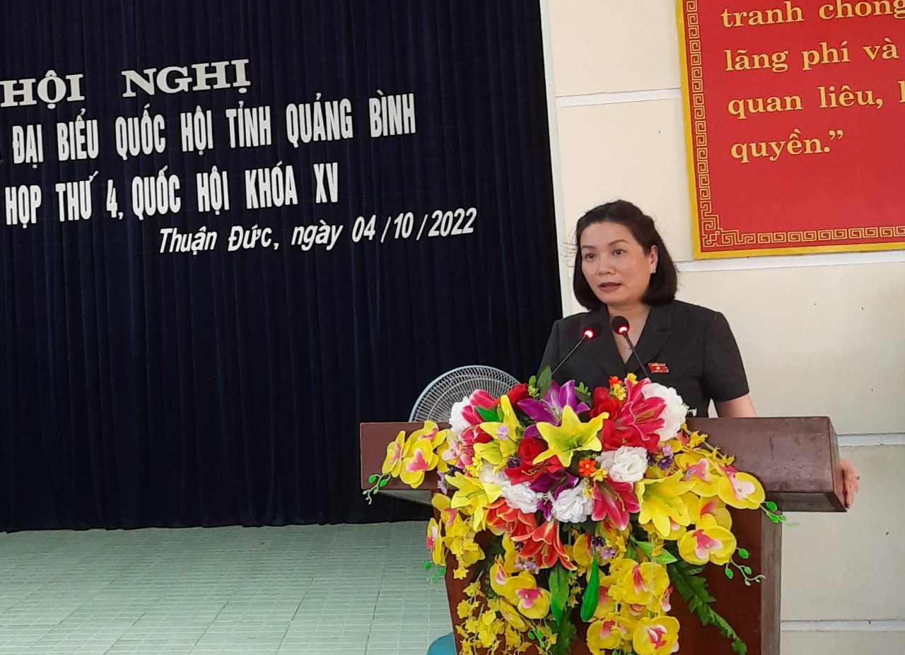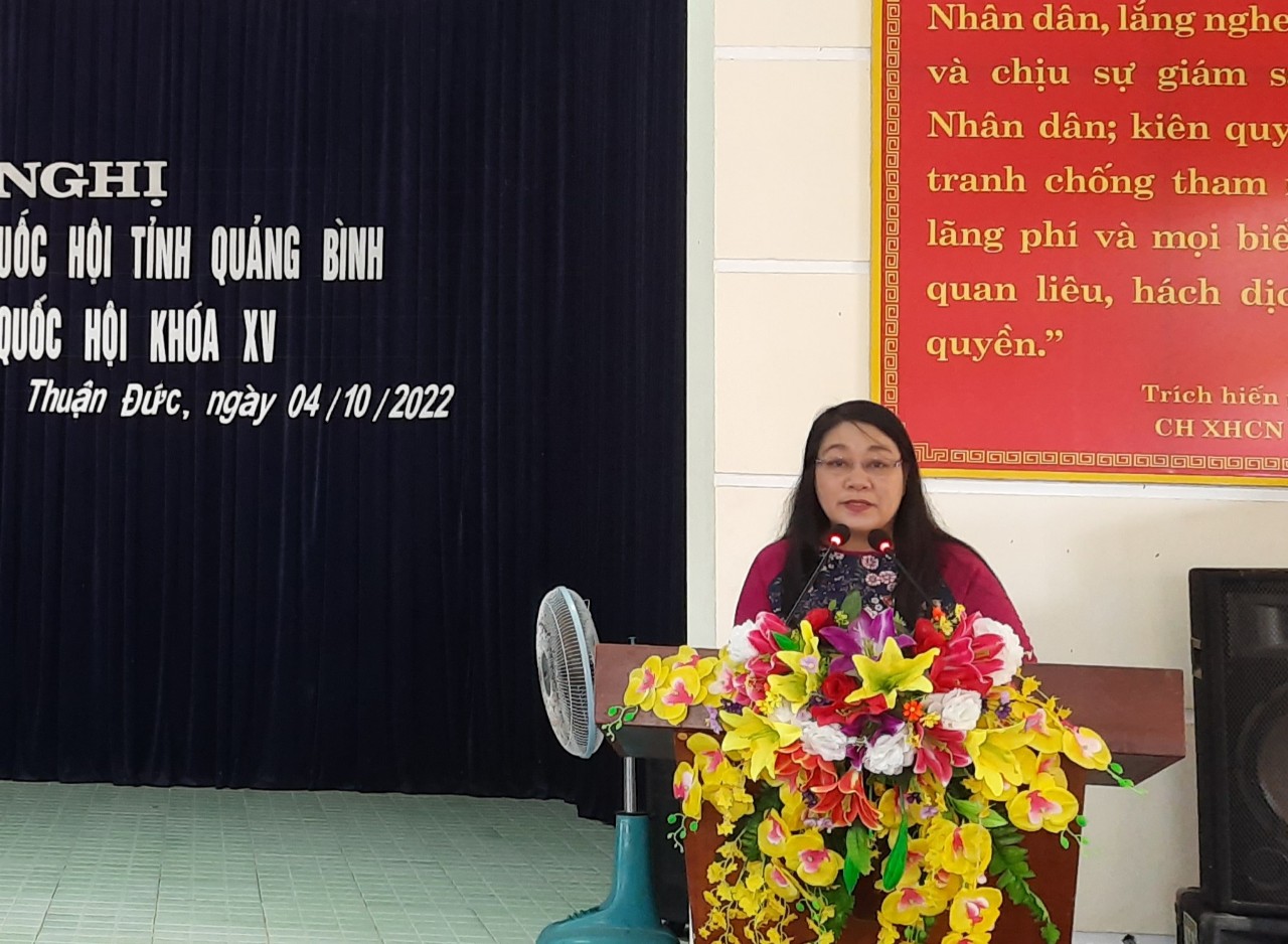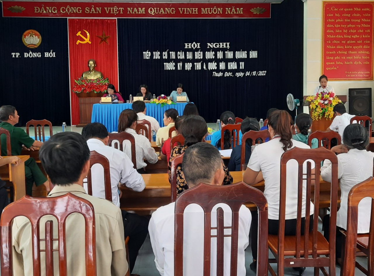 Chiều ngày 04/10/2022, tại Trung tâm văn hoá xã Thuận Đức, thành phố Đồng Hới, các vị đại biểu Quốc hội (ĐBQH) thuộc Đoàn ĐBQH tỉnh gồm: Bà Nguyễn Minh Tâm, Tỉnh ủy viên, Phó Trưởng đoàn chuyên trách; Bà Nguyễn Thị Tuyết Nga, Ủy viên chuyên trách Ủy ban Văn hoá, Giáo dục của Quốc hội đã có buổi tiếp xúc với cử tri thành phố Đồng Hới trước kỳ họp thứ 4, Quốc hội khóa XV.