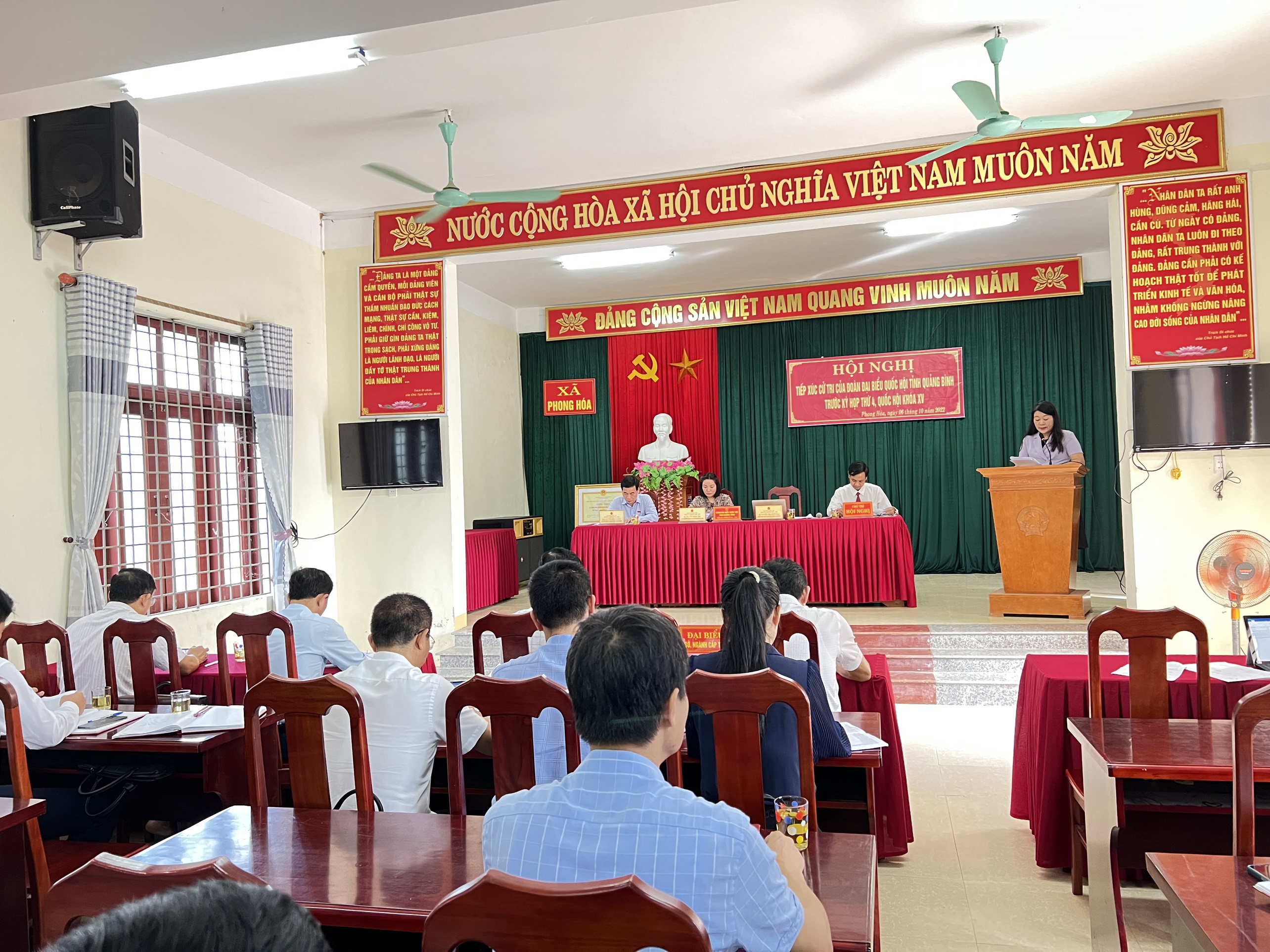 Sáng ngày 06/10/2022, Đoàn đại biểu Quốc hội (ĐBQH) tỉnh Quảng Bình đã tiến hành tiếp xúc cử tri trược kỳ họp thứ 4, Quốc hội khóa XV tại Hội trường Ủy ban nhân dân xã Phong Hóa, huyện Tuyên Hóa. Tham gia tiếp xúc cử tri có Bà Nguyễn Minh Tâm, Tỉnh ủy viên, Phó Trưởng Đoàn ĐBQH tỉnh; ông Nguyễn Mạnh Cường, Phó Chủ nhiệm Ủy ban Tư pháp của Quốc hội và bà Nguyễn Thị Tuyết Nga, Ủy viên chuyên trách Ủy ban Văn hoá - Giáo dục của Quốc hội.