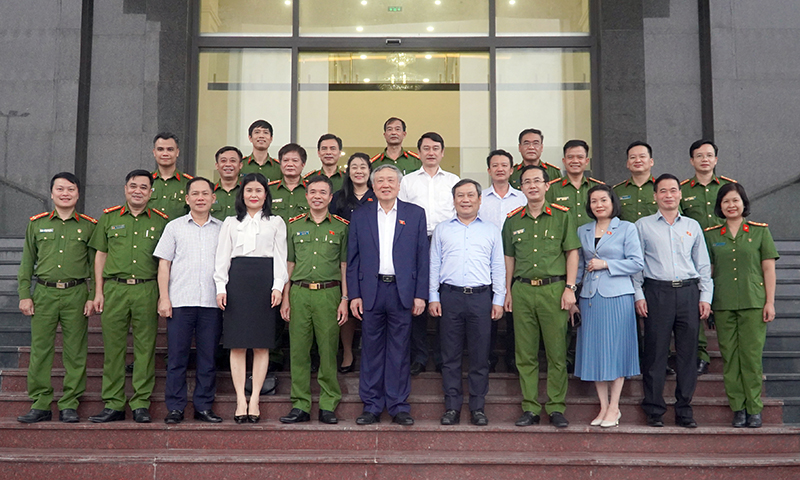 Các đại biểu Quốc hội chụp ảnh lưu niệm cùng đồng chí Nguyễn Hòa Bình và lãnh đạo Viện Khoa học Hình sự