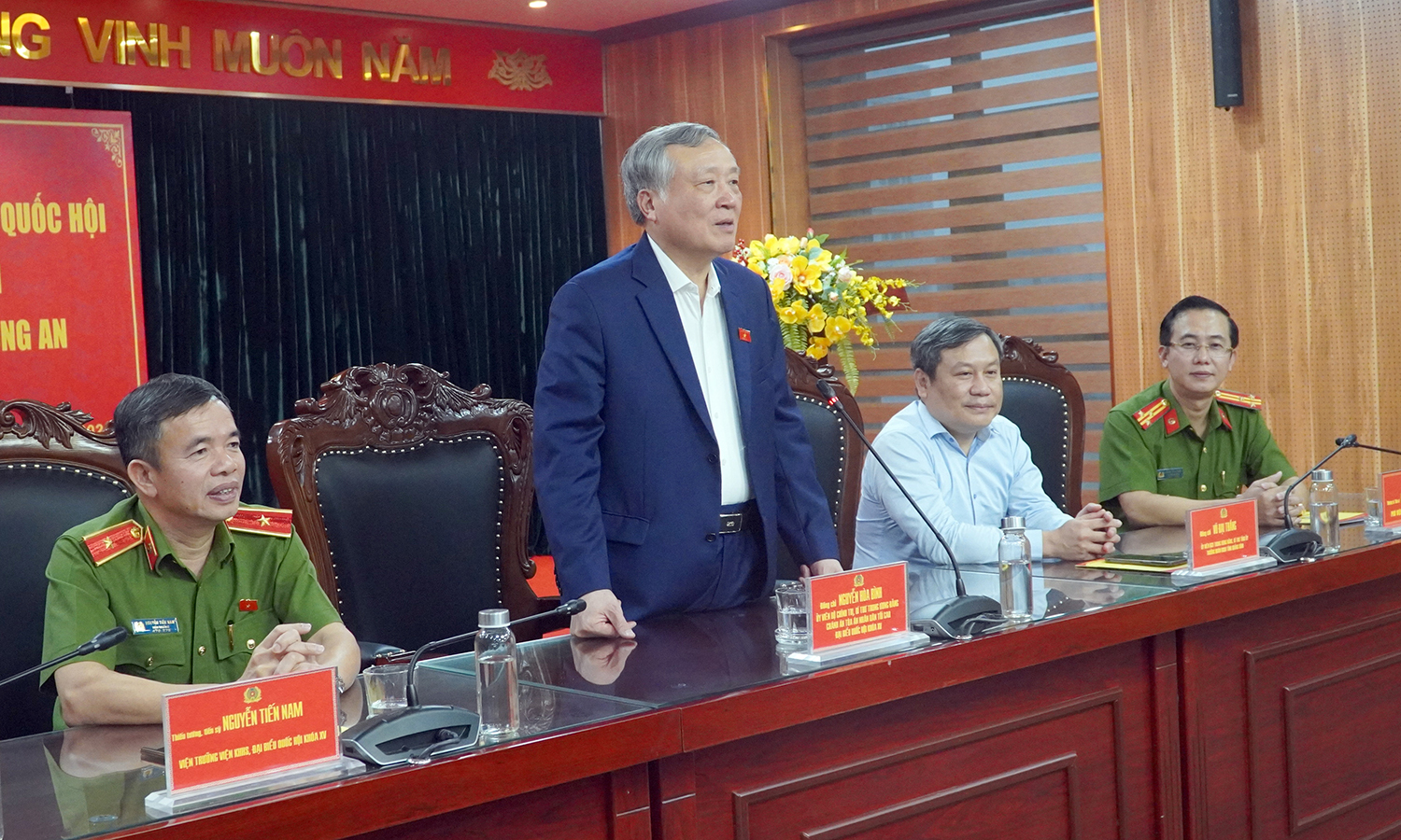 Thay mặt cán bộ, chiến sĩ Viện KHHS, Thiếu tướng Nguyễn Tiến Nam tiếp thu các ý kiến chỉ đạo của đồng chí Nguyễn Hòa Bình và mong muốn tiếp tục nhận được sự quan tâm chỉ đạo của đồng chí, sự đồng hành, ủng hộ của các ĐBQH để lực lượng thực hiện tốt hơn nhiệm vụ của mình, xứng đáng với niềm tin cậy của Đảng và nhân dân.
