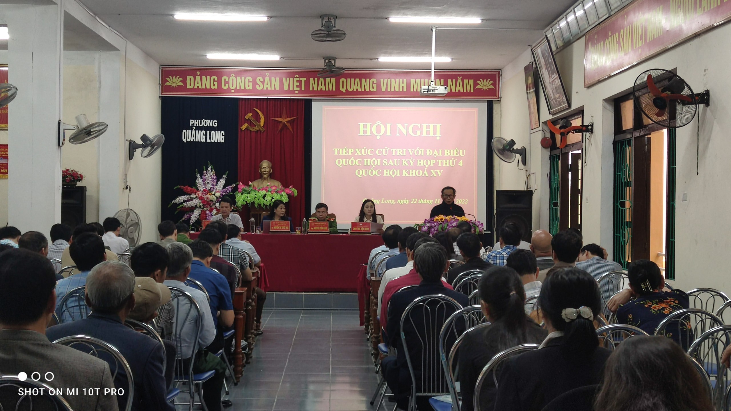 Chiều cùng ngày, tại hội trường UBND phường Quảng Long, thị xã Ba Đồn các đại biểu Quốc hội tỉnh có buổi tiếp xúc cử tri tại đây. Tham gia có đại diện lãnh đạo Sở Lao động-Thương binh và Xã hội, Sở Nông nghiệp và Phát triển nông thôn, Sở Giáo dục và Đào tạo, lãnh đạo Thị ủy, Ủy ban Mặt trận TQVN thị xã Ba Đồn, Thường trực HĐND, UBND thị xã Ba Đồn.