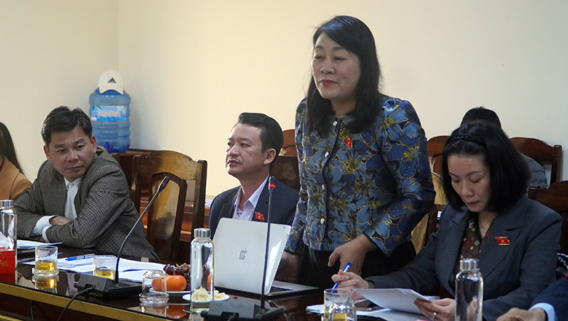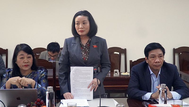 Đồng chí Nguyễn Thị Tuyết Nga - đại biểu chuyên trách Ủy ban Văn hóa, Giáo dục Quốc hội, thành viên Đoàn giám sát đặt ra các vấn đề đề nghị cơ quan chịu sự giám sát giải trình, làm rõ