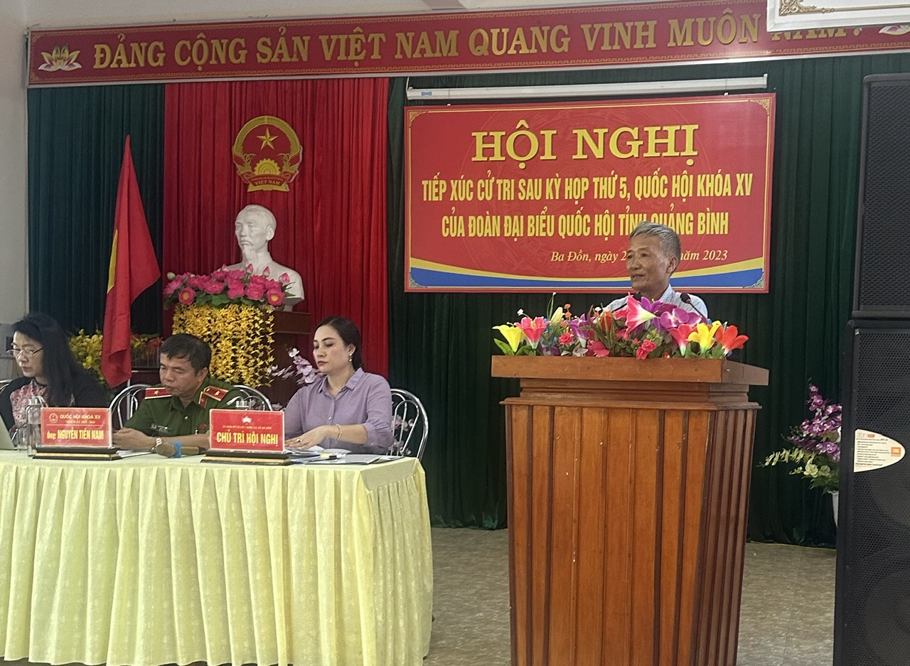 Chiều ngày 29/6/2023, tại phường Ba Đồn, thị xã Ba Đồn, tổ đại biểu Quốc hội tỉnh gồm các đại biểu: Thiếu tướng Nguyễn Tiến Nam, Viện trưởng Viện Khoa học hình sự (Bộ Công an); Nguyễn Thị Tuyết Nga, Ủy viên chuyên trách Ủy ban Văn hóa, Giáo dục của Quốc hội khóa XV, Trần Quang Minh, Phó Chủ tịch Ủy ban MTTQVN tỉnh đã có buổi tiếp xúc với cử tri thị xã Ba Đồn sau kỳ họp thứ 5, Quốc hội khóa XV. Tham dự có đại diện lãnh đạo các sở: Y tế, Lao động, Thương binh và Xã hội, Nội vụ và lãnh đạo các ban, ngành, thể thuộc thị xã Ba Đồn.