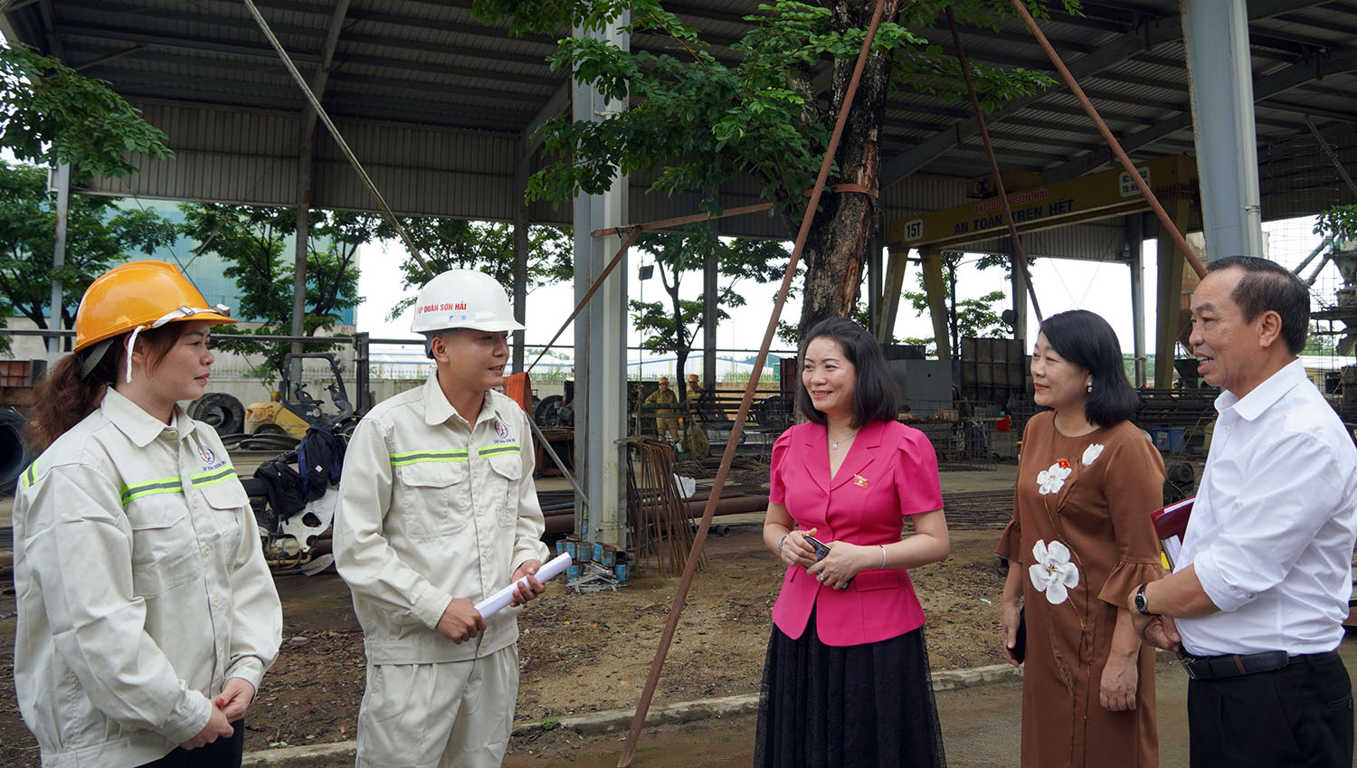 Đồng chí Nguyễn Minh Tâm và các thành viên đoàn giám sát kiểm tra hiện trường nhà máy của Công ty TNHH Tập đoàn Sơn Hải.