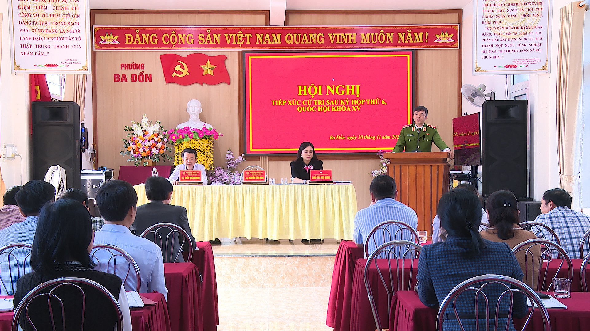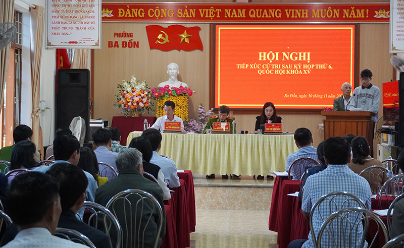 Sáng ngày 30/11/2023, tại UBND phường Ba Đồn, thị xã Ba Đồn, các vị ĐBQH thuộc Đoàn đại biểu Quốc hội tỉnh Quảng Bình gồm: Thiếu tướng Nguyễn Tiến Nam, Viện trưởng Viện khoa học hình sự Bộ Công an; ông Trần Quang Minh, Phó Chủ tịch Ủy ban MTTQVN tỉnh đã có buổi tiếp xúc với cử tri thị xã Ba Đồn sau kỳ họp thứ 6, Quốc hội khóa XV. Tham dự buổi tiếp xúc cử tri có đại diện lãnh đạo một số sở, ban, ngành, thị xã Ba Đồn và đông đảo cử tri trên địa bàn.