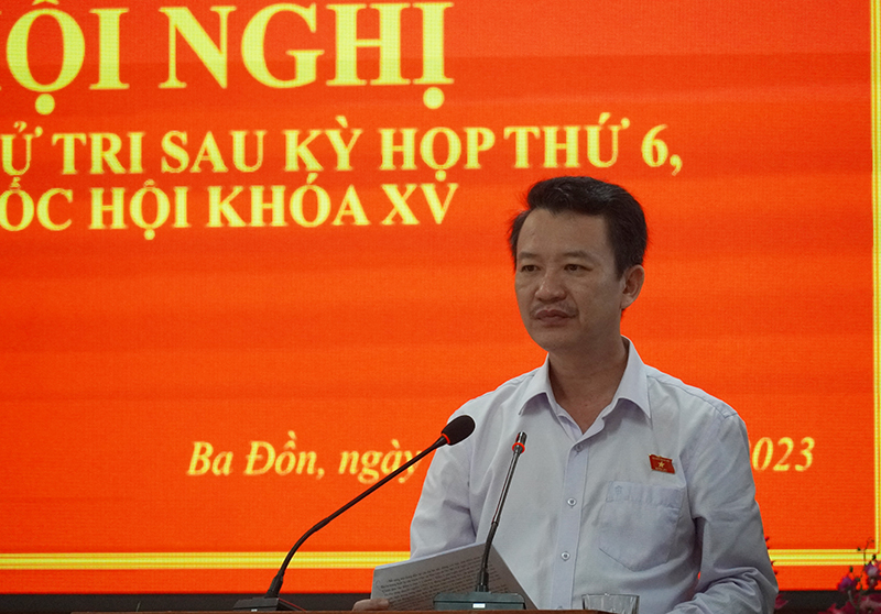 Thay mặt Đoàn ĐBQH tỉnh, ĐBQH Trần Quang Minh đã thông tin trước cử tri về kết quả kỳ họp thứ 6, Quốc hội khóa XV; theo đó, sau 22,5 ngày làm việc, Quốc hội đã xem xét, biểu quyết thông qua 07 luật, 09 nghị quyết, cho ý kiến lần 3 đối với dự án Luật Đất đai (sửa đổi), cho ý kiến lần 2 đối với dự án Luật Các tổ chức tín dụng (sửa đổi), cho ý kiến lần đầu đối với 08 dự án luật khác; lấy phiếu tín nhiệm đối với 44 người giữ chức vụ do Quốc hội bầu hoặc phê chuẩn; tiến hành chất vấn và trả lời chất vấn; xem xét, quyết định các vấn đề về kinh tế - xã hội, ngân sách nhà nước; xem xét các báo cáo về kiến nghị của cử tri và giải quyết các kiến nghị của cử tri cùng một số nội dung quan trọng khác.