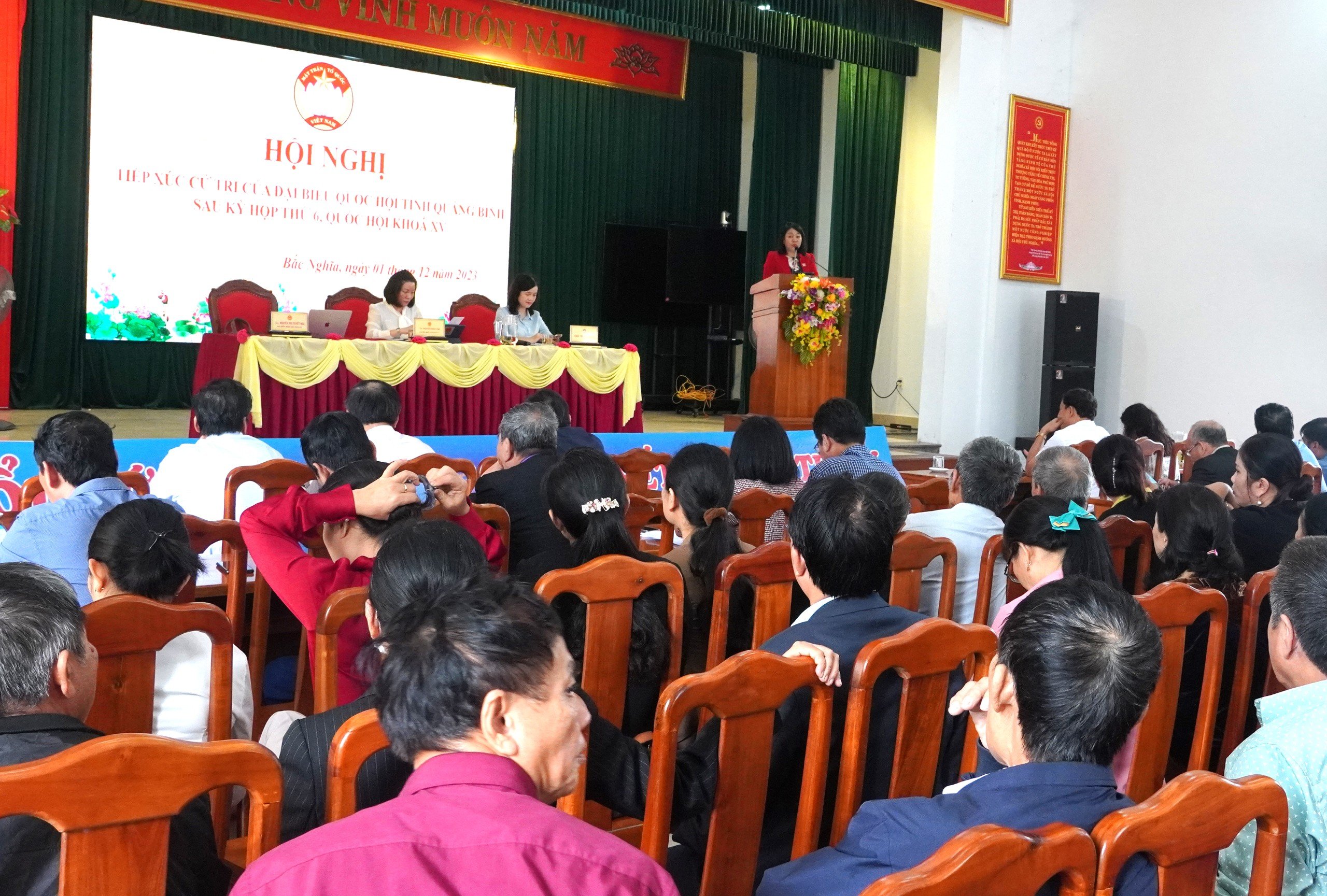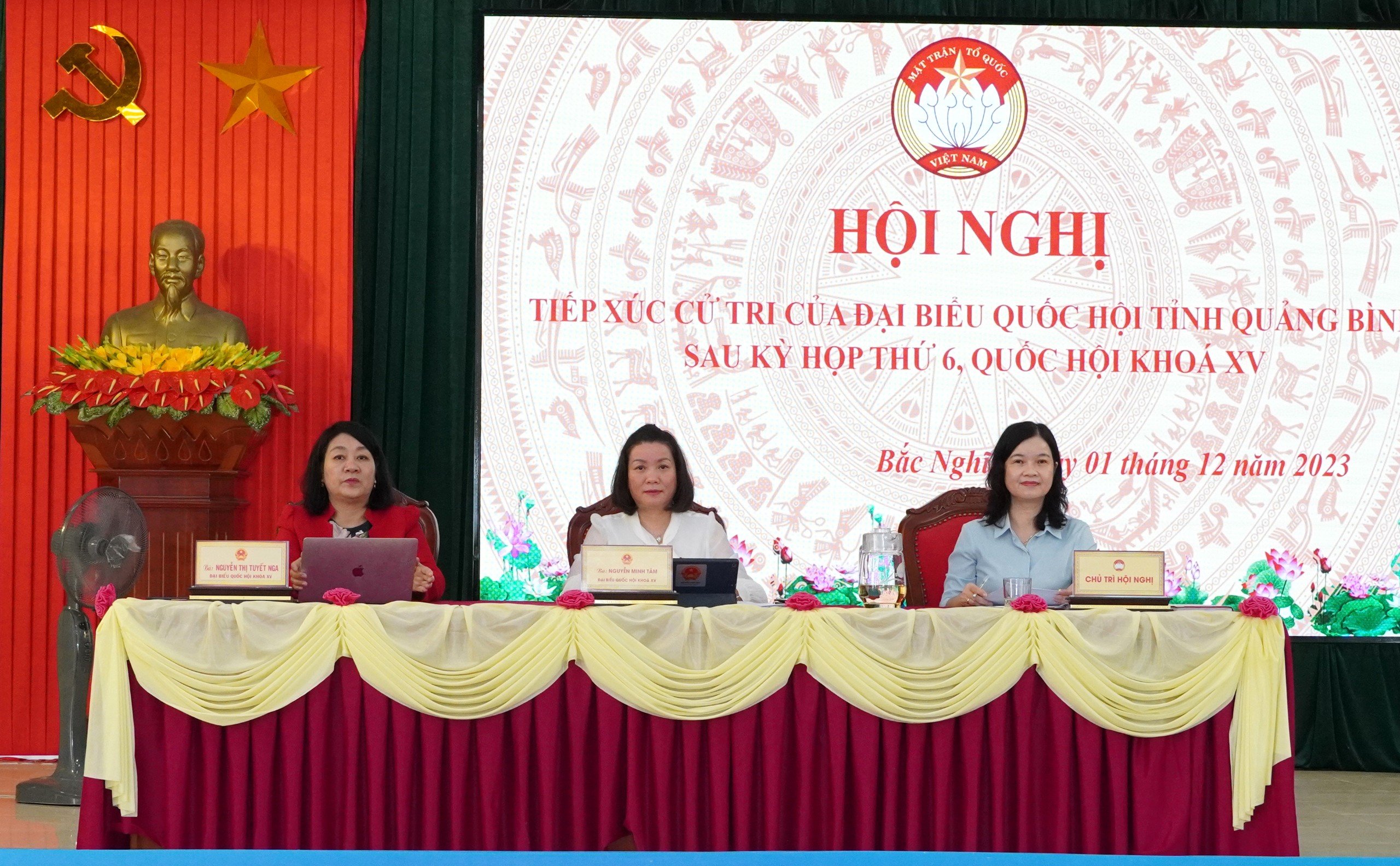 Sáng ngày 01/12/2023, Đoàn ĐBQH tỉnh Quảng Bình gồm bà Nguyễn Minh Tâm, Phó Trưởng đoàn Chuyên trách Đoàn Đại biểu Quốc hội tỉnh; bà Nguyễn Thị Tuyết Nga, Ủy viên chuyên trách Ủy ban Văn hóa, Giáo dục của Quốc hội, đại biểu Quốc hội tỉnh Quảng Bình đã tiếp xúc với cử tri tại phường Bắc Nghĩa, Thành phố Đồng Hới sau kỳ họp thứ 6, Quốc hội khóa XV. Tham dự có đại diện một số sở, ban, ngành, lãnh đạo thành phố và khoảng 150 cử tri địa bàn phường Đồng Hới.