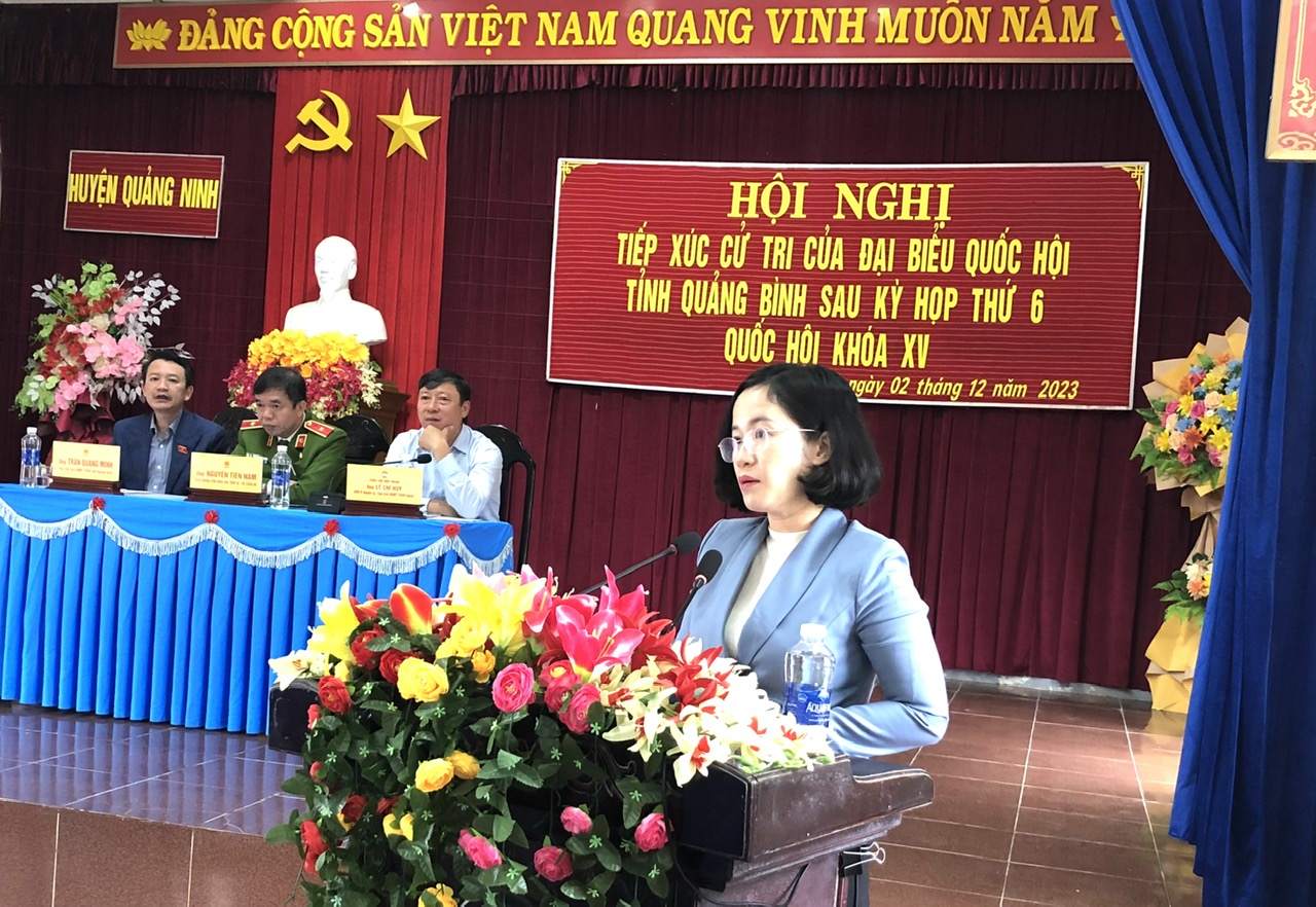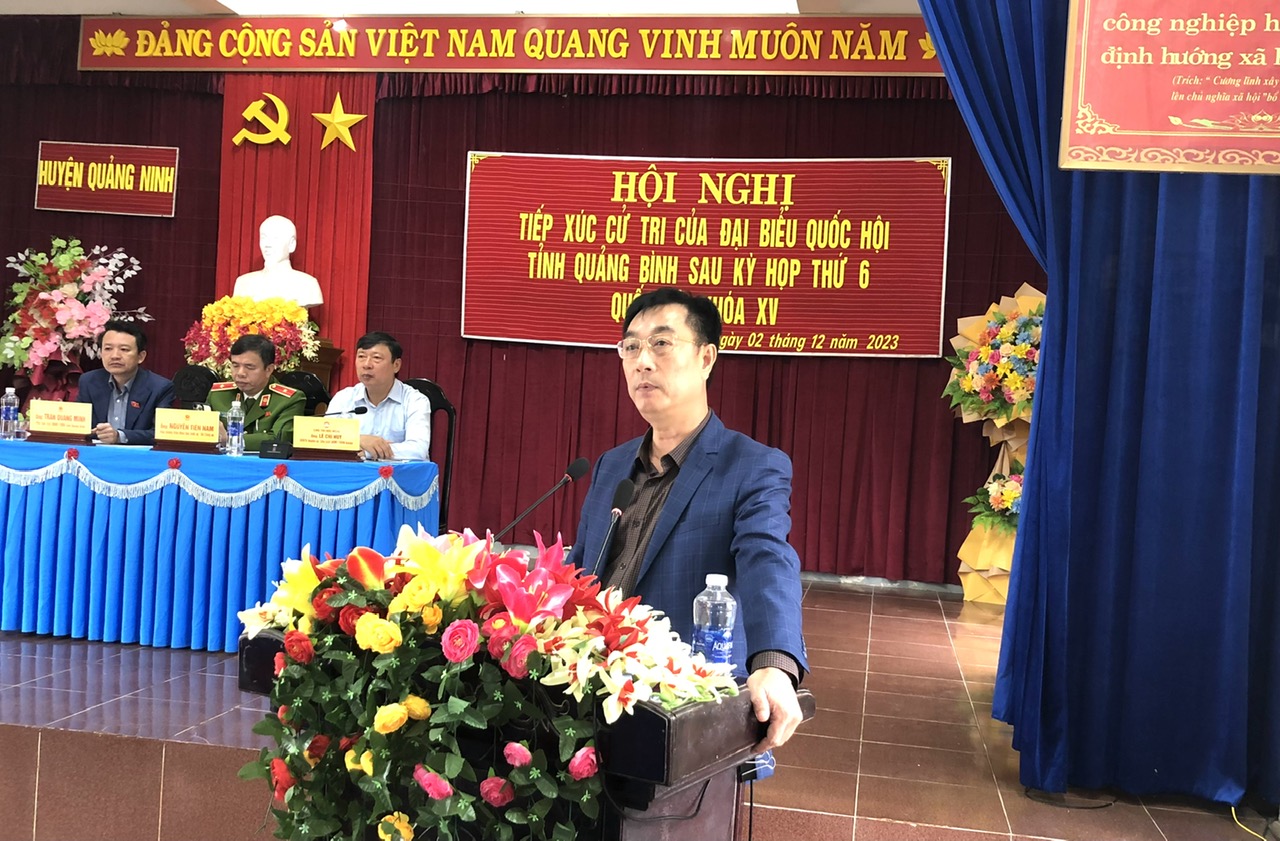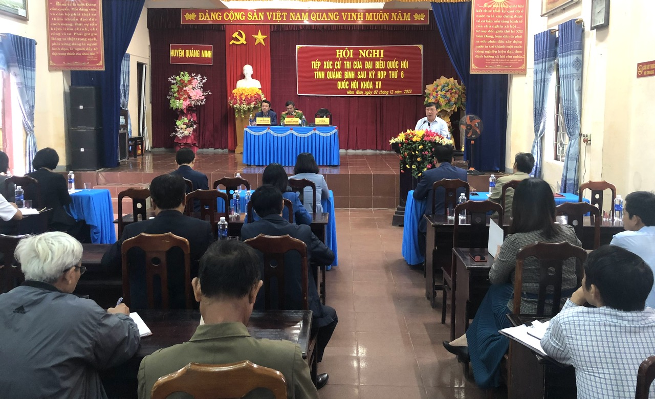 Cử tri huyện Quảng Ninh bày tỏ sự đồng tình, phấn khởi trước những kết quả đạt được của Quốc hội tại kỳ họp thứ 6 và đánh giá cao vai trò, trách nhiệm của Đoàn ĐBQH tỉnh thời gian qua đã tiếp thu, phản ánh kịp thời tâm tư, nguyện vọng của tri đến với diễn đàn Quốc hội; đồng thời nêu kiến nghị, đề xuất một số vấn đề liên quan đến: việc quan tâm, đầu tư xây dựng các công trình cầu, đê kè phục vụ dân sinh, sản xuất nông nghiệp; giải quyết dứt điểm các vấn đề liên quan đến đất đai, cấp giấy chứng nhận quyền sử dụng đất; chế độ chính sách đối với người từng tham gia kháng chiến, người có công với cách mạng…