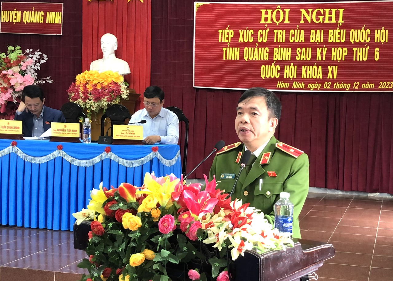 Sáng ngày 02/12/2023, tại UBND xã Hàm Ninh, huyện Quảng Ninh, các vị đại biểu Quốc hội thuộc Đoàn đại biểu Quốc hội tỉnh Quảng Bình gồm: Thiếu tướng Nguyễn Tiến Nam, Viện trưởng Viện khoa học hình sự Bộ Công an; ông Trần Quang Minh, Phó Chủ tịch Ủy ban MTTQVN tỉnh đã có buổi tiếp xúc với cử tri huyện Quảng Ninh sau kỳ họp thứ 6, Quốc hội khóa XV. Tham dự buổi tiếp xúc cử tri có đại diện lãnh đạo một số sở, ban, ngành, huyện Quảng Ninh và đông đảo cử tri trên địa bàn huyện.