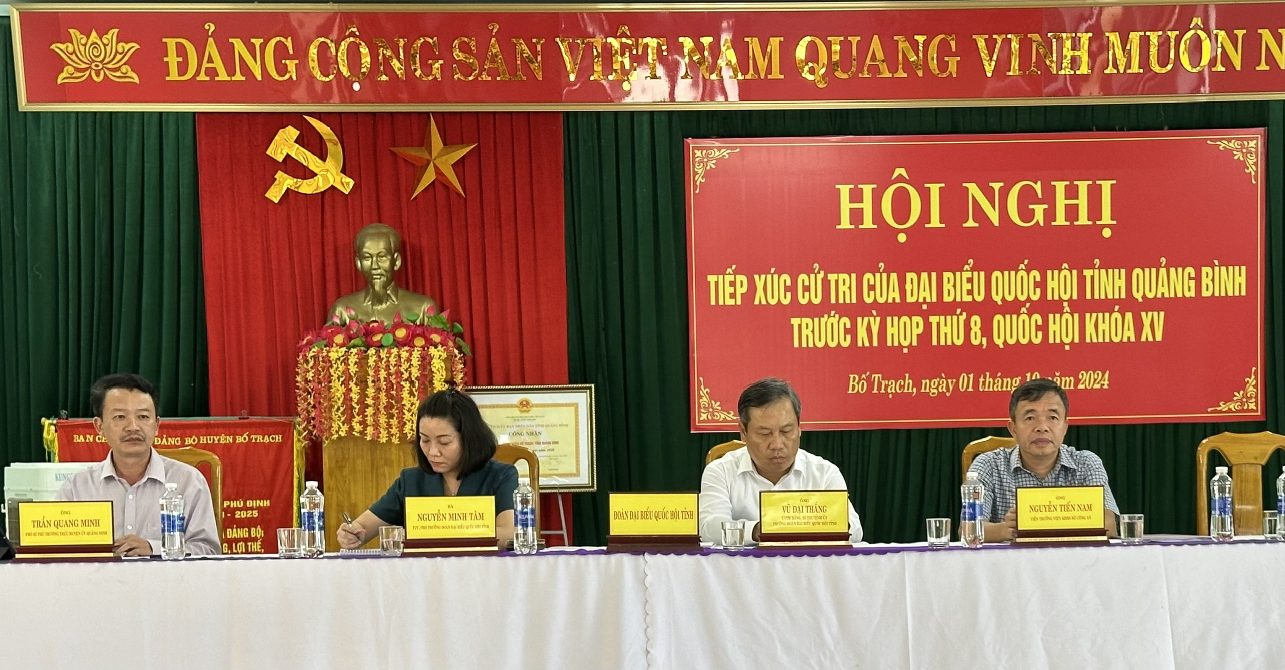 Chiều ngày 01/10/2024 tại xã Phú Định, huyện Bố Trạch, Đoàn đại biểu Quốc hội (ĐBQH) tỉnh gồm: Ông Vũ Đại Thắng, UVBCHTWĐ, Bí thư Tỉnh ủy, Trưởng Đoàn ĐBQH tỉnh; ông Nguyễn Tiến Nam Viện trưởng Viện khoa học hình sự Bộ Công an; bà Nguyễn Minh Tâm, TUV, Phó Trưởng Đoàn chuyên trách Đoàn ĐBQH tỉnh; ông Trần Quang Minh, Phó Bí thư Thường trực huyện Quảng Ninh đã có buổi tiếp xúc cử tri trước kỳ họp thứ 8, Quốc hội khóa XV. Tham dự buổi tiếp xúc cử tri có đại diện lãnh đạo sở Tài nguyên và Môi trường, sở Giao thông và Vận tải, Sở Lao động, Thương binh và Xã hội; lãnh đạo Huyện ủy, Thường trực HĐND, UBND huyện và đông đảo cử tri trên địa bàn.