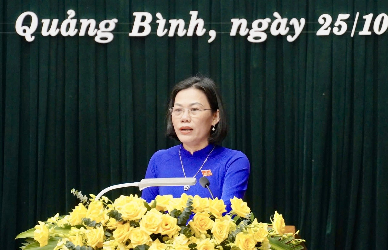 Bà Ngô Nữ Quỳnh Trang, Phó Trưởng Ban Kinh tế - Ngân sách HĐND tỉnh trình bày báo cáo thẩm tra tại kỳ họp