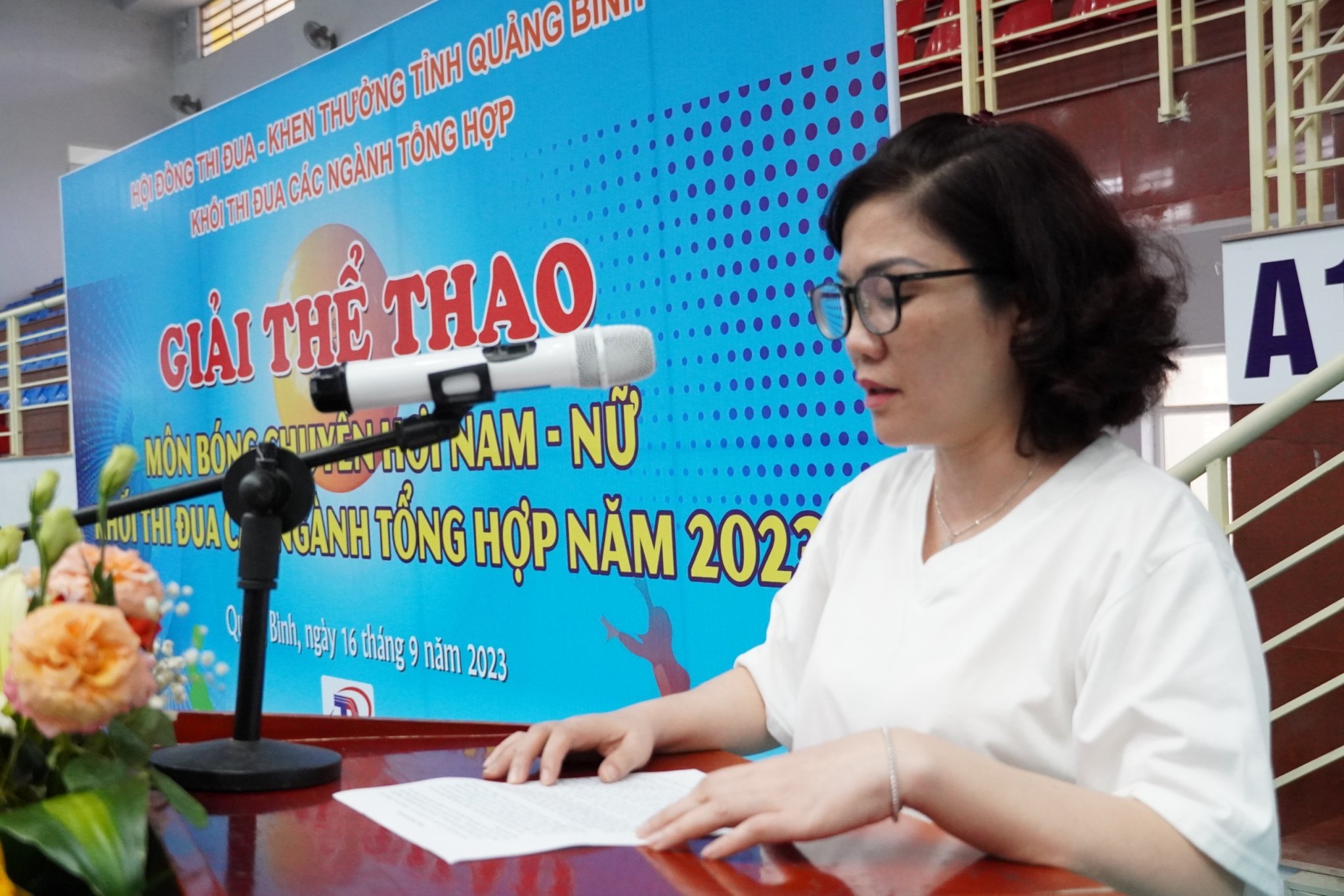 Tại buổi khai mạc, đồng chí Nguyễn Thị Mai - Chánh Văn phòng Đoàn ĐBQH và HĐND tỉnh (đại diện lãnh đạo đơn vị Trưởng khối) đã có bài phát biểu khai mạc Giải. Theo đó, Giải bóng chuyền được tổ chức trong những ngày cùng cả nước Kỷ niệm ngày Cách mạng Tháng Tám và Quốc khánh 02/9; chào mừng Đại hội lần thứ XIII Công đoàn Việt Nam, nhiệm kỳ 2023 - 2028; cùng với toàn Đảng bộ, nhân dân tỉnh nhà đang phát động Đợt thi đua đặc biệt Kỷ niệm 420 năm hình thành tỉnh Quảng Bình (1604 - 2024); 75 năm ngày Quảng Bình quật khởi (15/7/1949 - 15/7/2024) và 35 năm ngày tái lập tỉnh (01/7/1989 - 01/7/2024). Đồng thời, mục đích giải duy trì và đẩy mạnh phong trào rèn luyện thân thể và đây là một hoạt động bổ ích, đầy ý nghĩa, thiết thực chào mừng các ngày lễ lớn của đất nước và hưởng ứng cuộc vận động “Toàn dân rèn luyện thân thể theo gương Bác Hồ vĩ đại”. Qua đó, tạo sân chơi lành mạnh, tăng cường tinh thần giao lưu, học hỏi, đoàn kết giữa cán bộ, công chức, viên chức, người lao động của 08 đơn vị thành viên trong Khối nhằm góp phần hoàn thành tốt nhiệm vụ được giao.