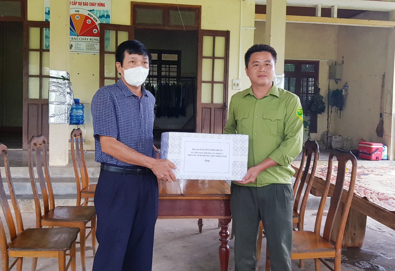 Đồng chí Nguyễn Công Huấn tặng quà cho cán bộ Trạm quản lý, bảo vệ rừng lâm trường Khe Giữa thuộc Công ty TNHH MTV LCN Long Đại